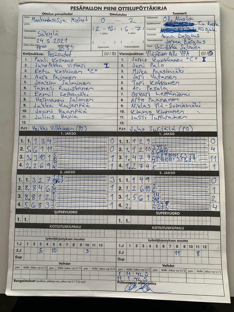 | 24.6.2021 | Pesäsudet | YPA | 0-2 (2-16, 6-7) | näytä | |