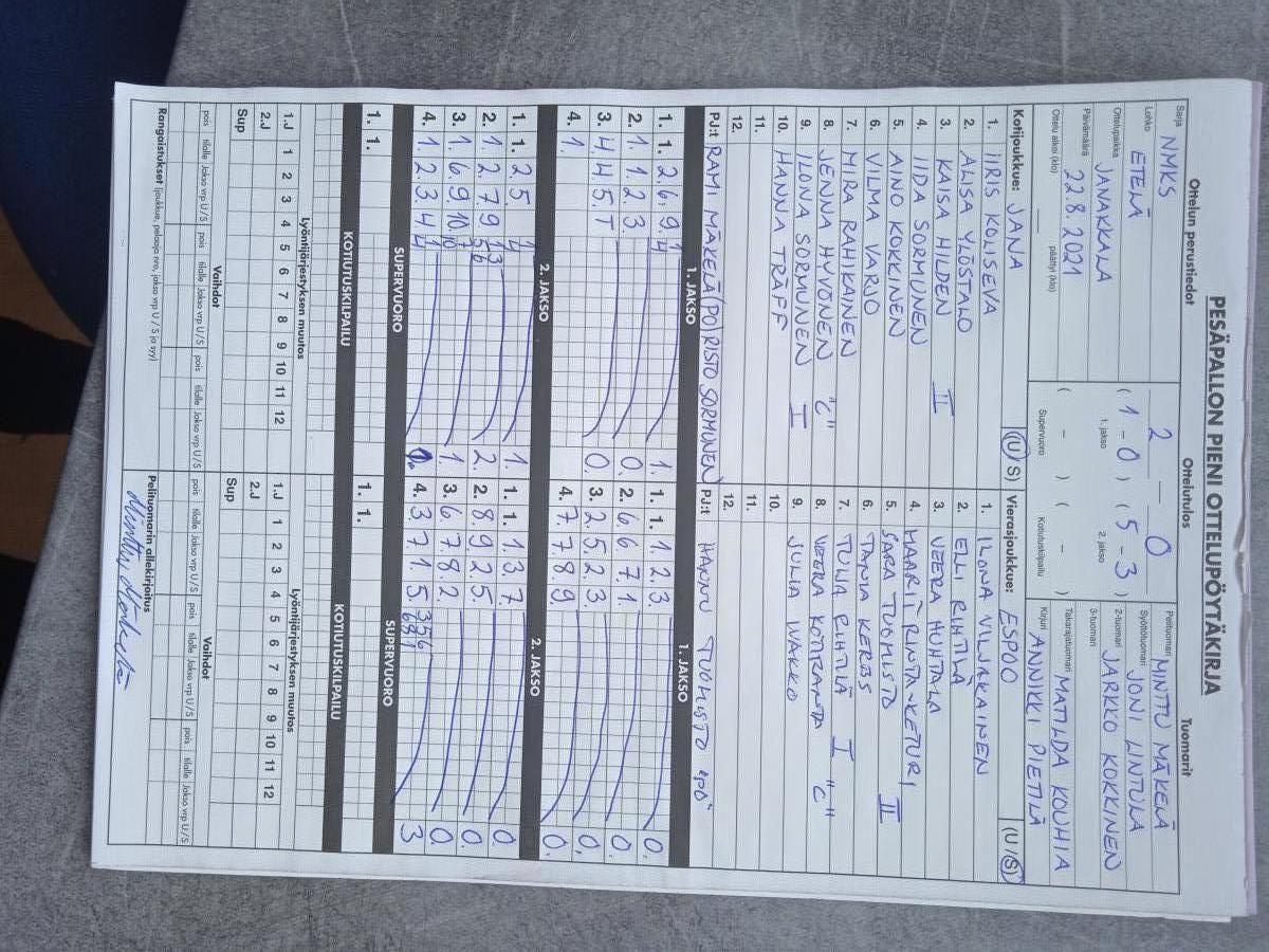 | 16.6.2021 | Jana pesis | Vihdin Pallo | 0-2 (4-5, 4-10) | näytä | |