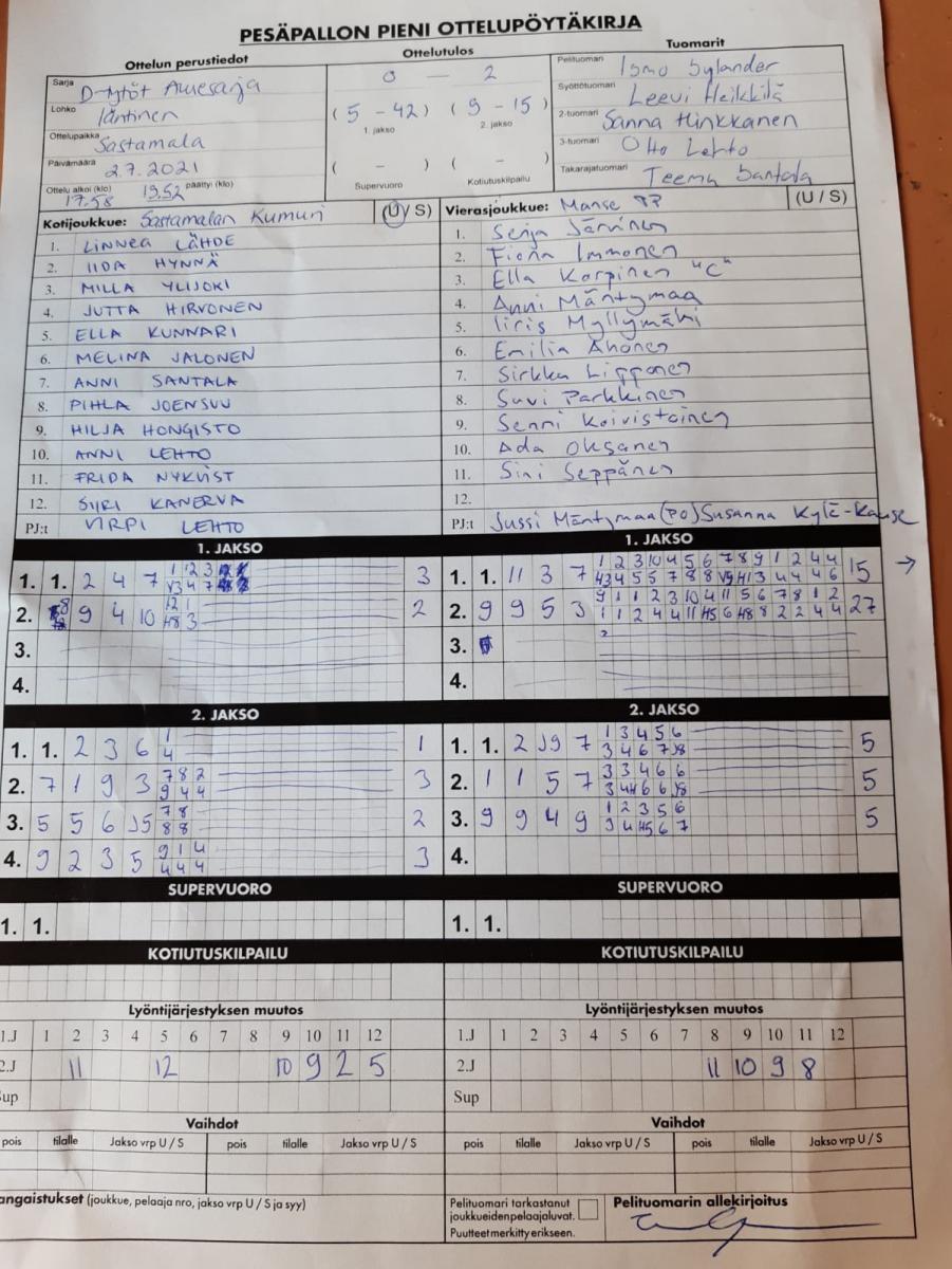 | 14.8.2021 00:00 | Sastamalan Kumuri | Lajy D2 | 0-2 (4-25, 0-15) | näytä | |
