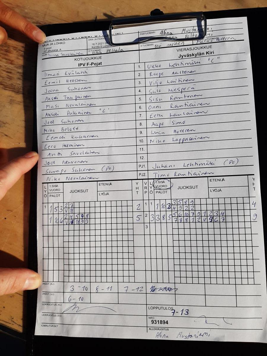 | 16.7.2021 08:30 | Kenttä 8 Lehtikankaan koulu kumirouhe | IPV F-Pojat | Jyväskylän Kiri | 7-13 | näytä |
