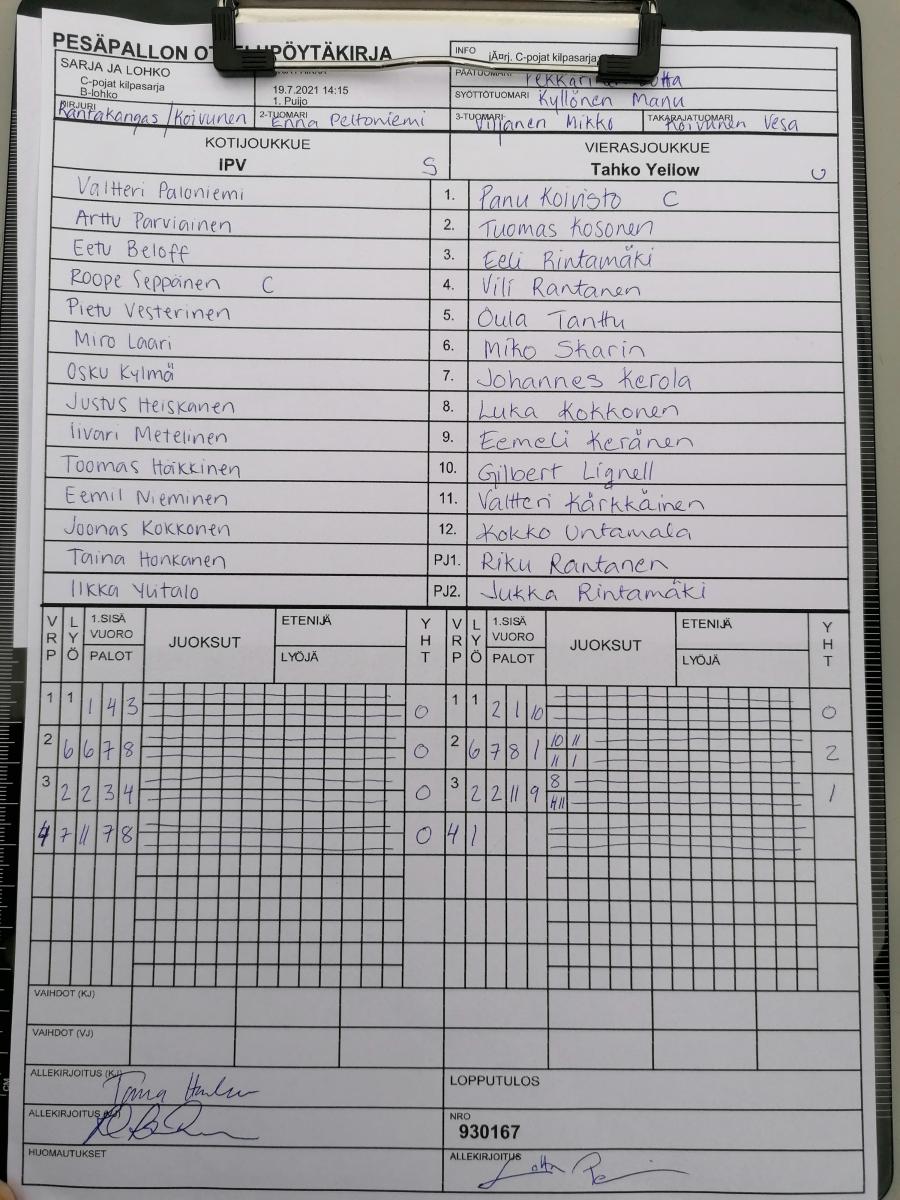 | C-pojat kilpasarja - A-lohko | 19.7.2021 17:15 | 2. Neulamäki | JoMa | KiPa -90 | Tahko Yellow |