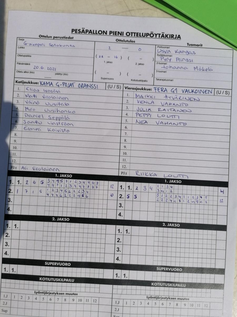 | 20.6.2021 11:00 | KaMa G-pojat Oranssi | Fera G1 valkoinen | 22-16 | näytä | |