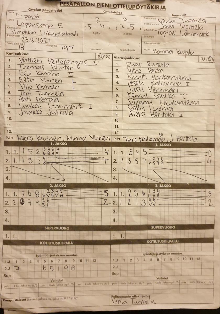 | 14.8.2021 14:00 | ViVe sininen | Vaasan Maila F-pojat | 1-2 (11-7, 6-7, 1-6) | näytä | |
