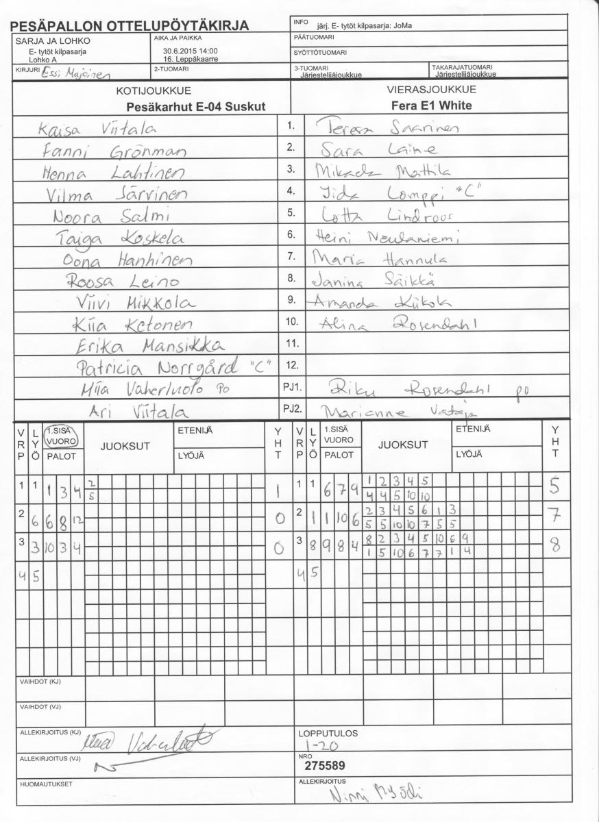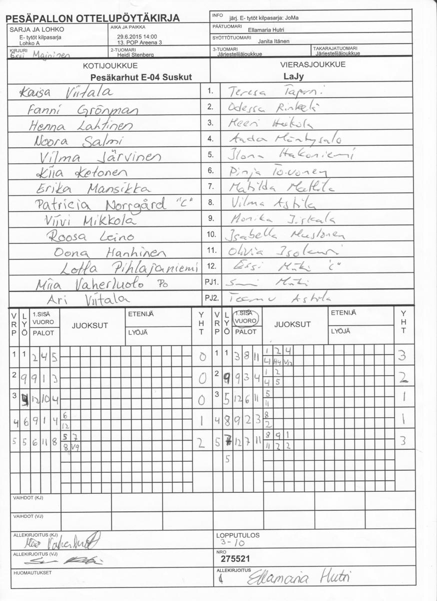 | E- tytöt kilpasarja - Lohko A | 30.6.2015 15:00 | 16. Leppäkaarre | JoMa | LaJy | Pesäkarhut E-04 Suskut |