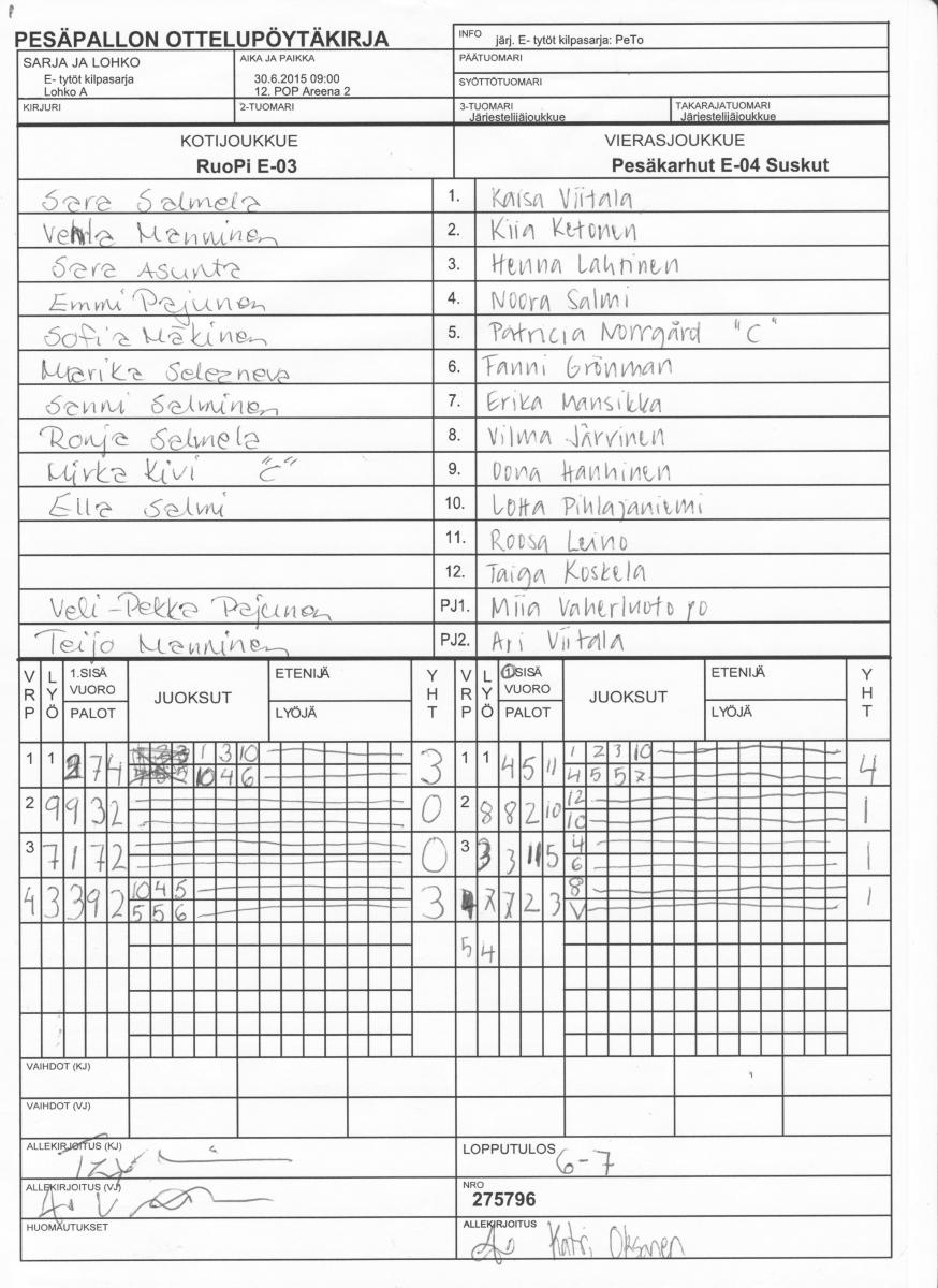 | 30.6.2015 09:00 | 12. POP Areena 2 | RuoPi E-03 | Pesäkarhut E-04 Suskut | 6-7 | näytä |
