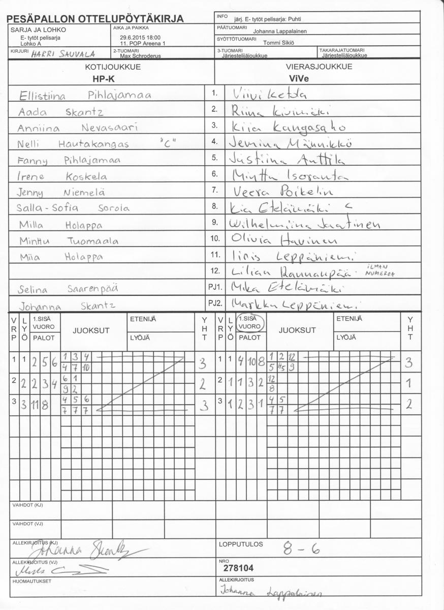 | E- tytöt pelisarja - Lohko D | 29.6.2015 19:00 | 11. POP Areena 1 | Puhti | JoMa+ | ViVe |