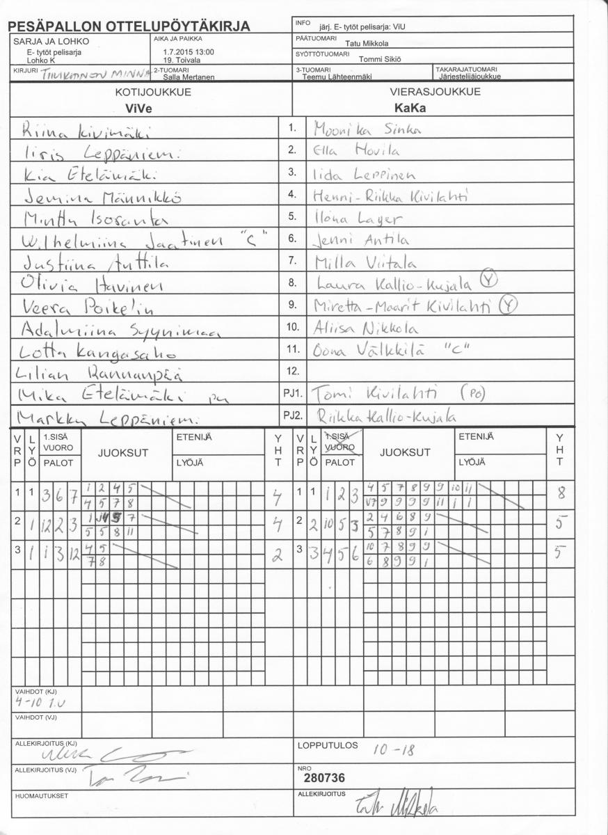 | 3.7.2015 10:00 | 18. Kasurila | YK | ViVe | 10-12 | näytä |