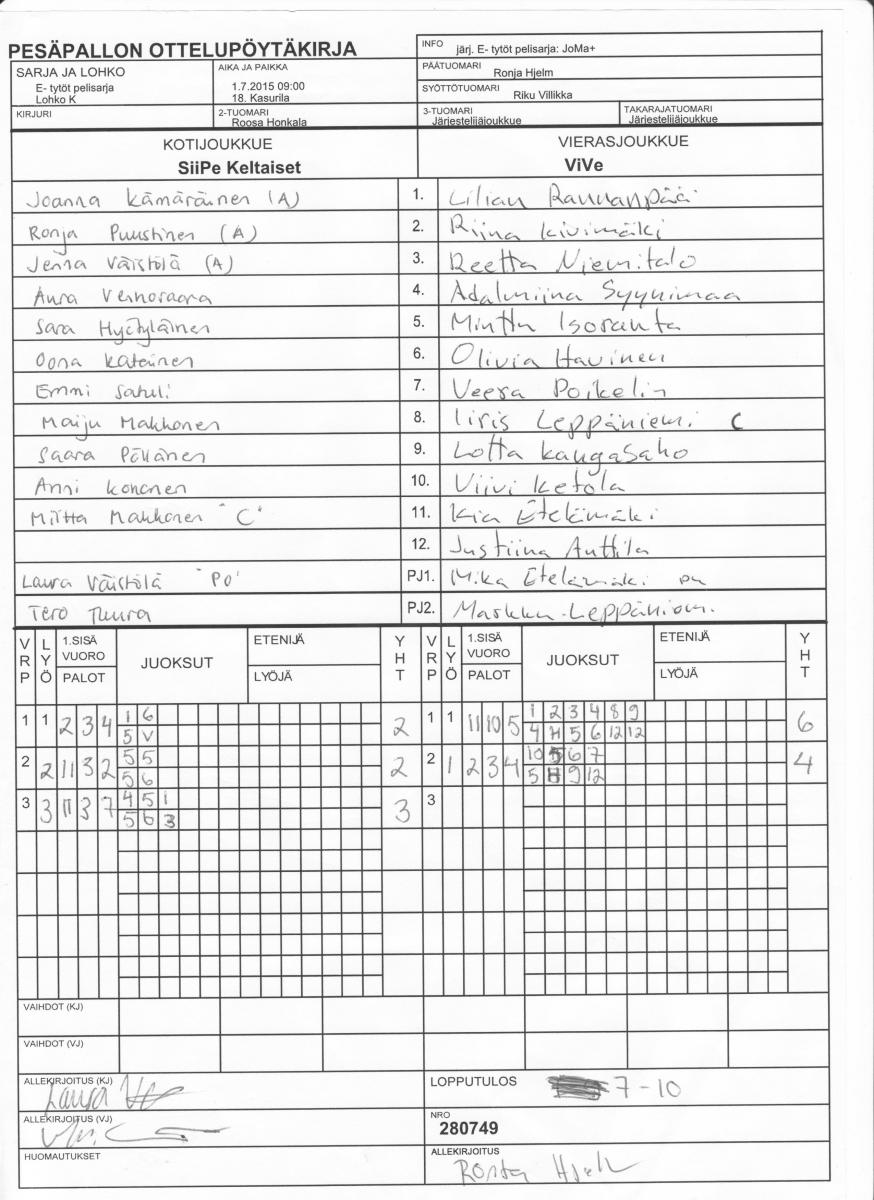 | 1.7.2015 09:00 | 18. Kasurila | SiiPe Keltaiset | ViVe | 7-10 | näytä |