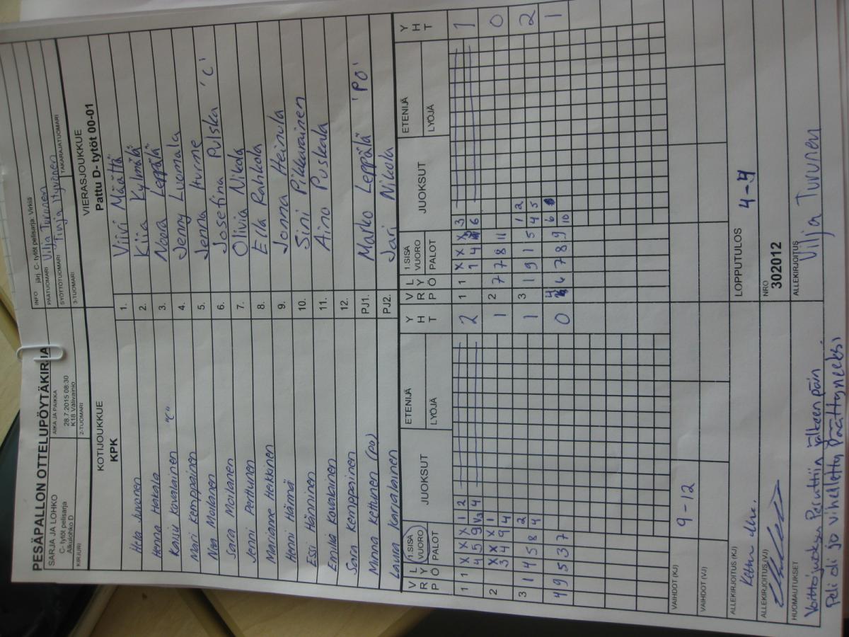 | Alkulohko D | 27.7.2015 13:00 | K14 Pitkäkangas tekonurmi, Oulunsalo | KPK | Espoo 2 | Pattu D- tytöt 00-01 |
