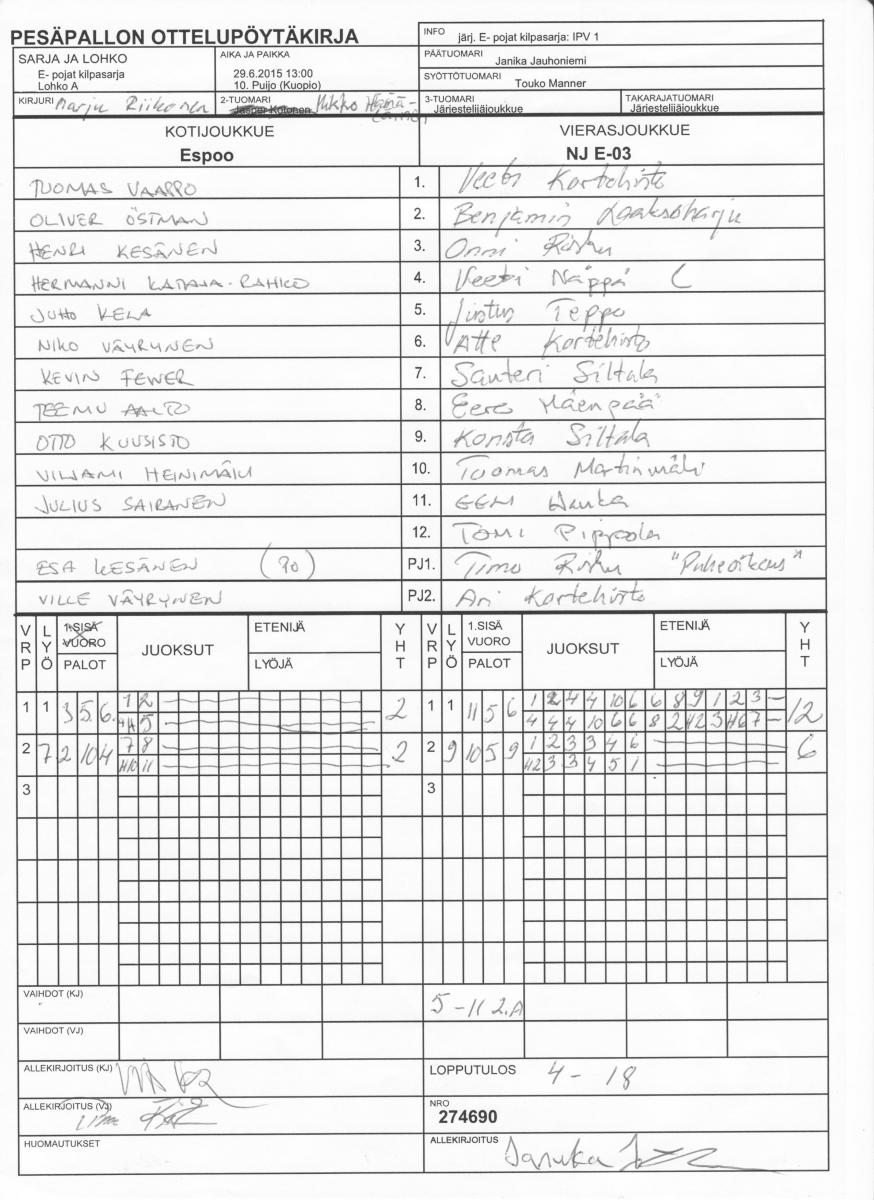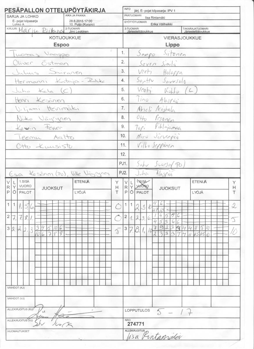 | E- pojat kilpasarja - Lohko A | 30.6.2015 14:00 | 10. Puijo (Kuopio) | Lippo | IPV 1 | Espoo |
