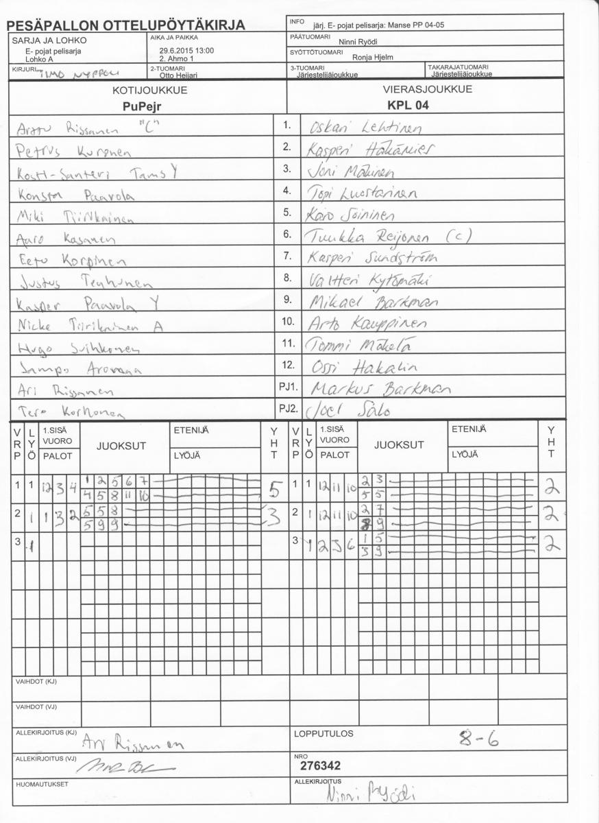 | E- pojat pelisarja - Lohko A | 29.6.2015 14:00 | 2. Ahmo 1 | SMJ -03 Punainen | Manse PP 04-05 | PuPejr |