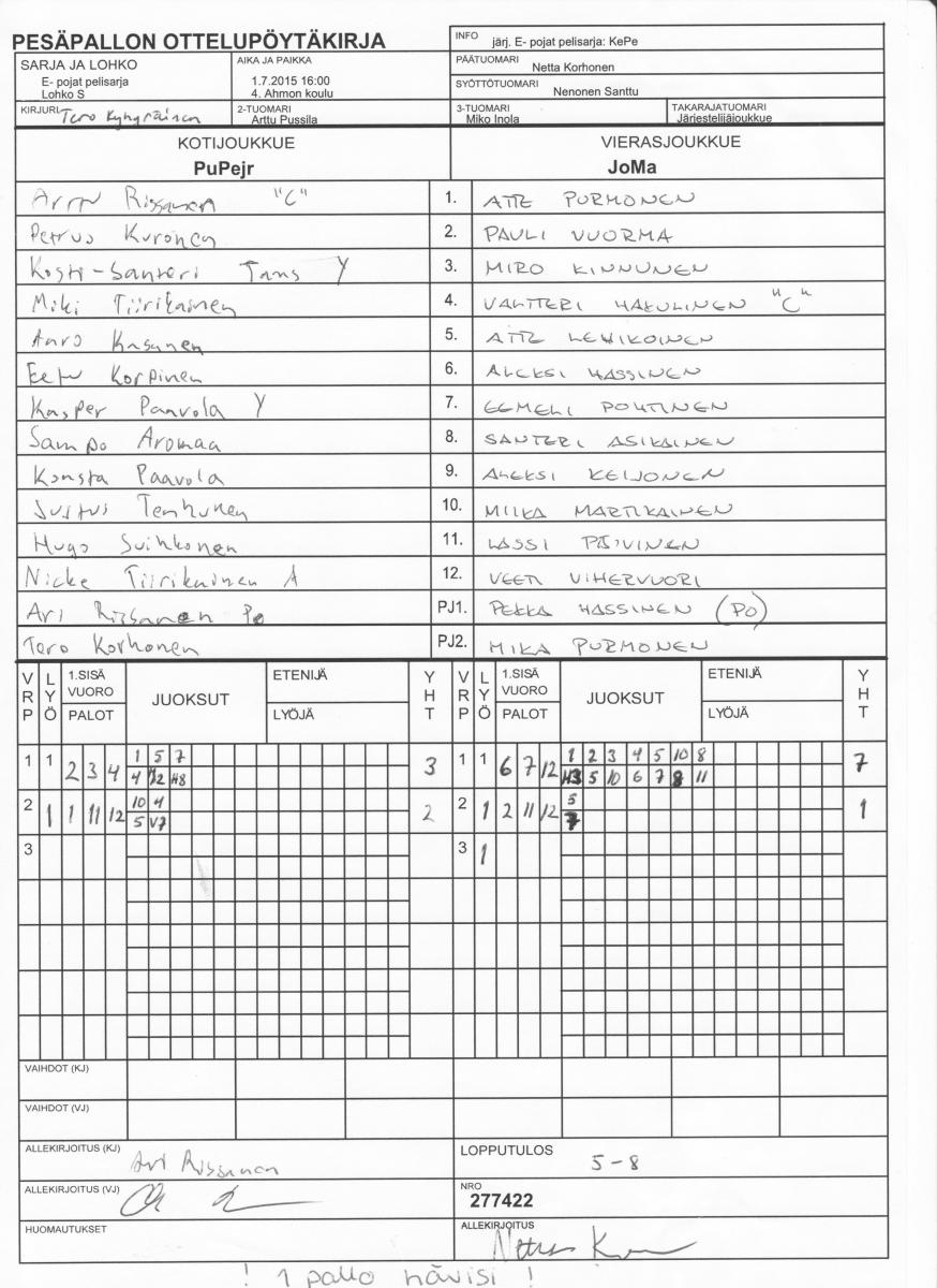 | Lohko K | 30.6.2015 08:00 | 3. Ahmo 2 | KePe | SiiPe Keltaiset | PuPejr |