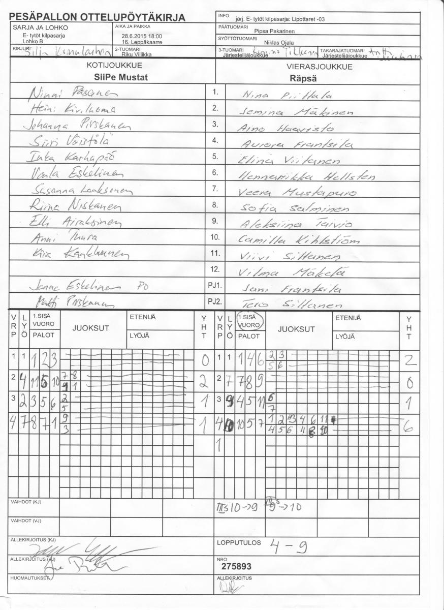| E- tytöt kilpasarja - Lohko B | 28.6.2015 17:00 | 16. Leppäkaarre | Lipottaret -03 | Pesäkarhut E03 | SiiPe Mustat |