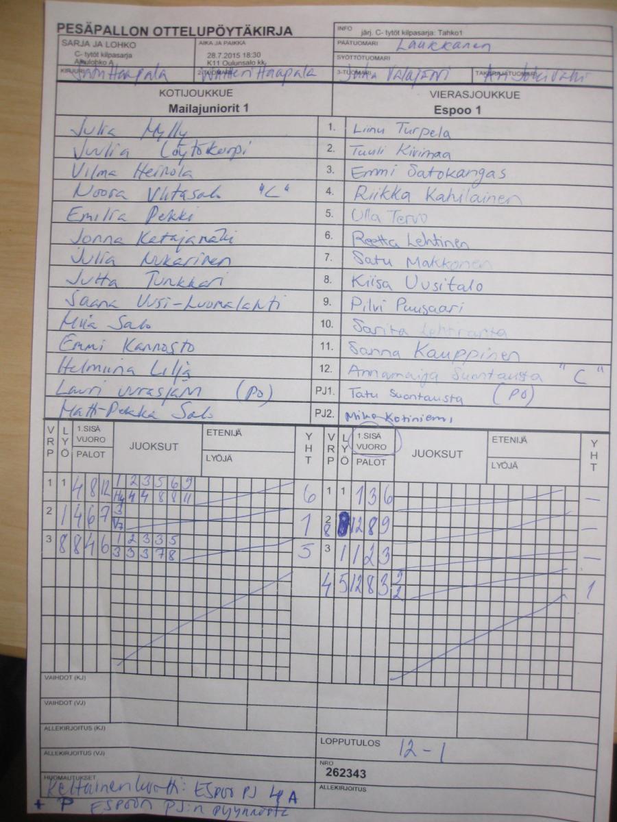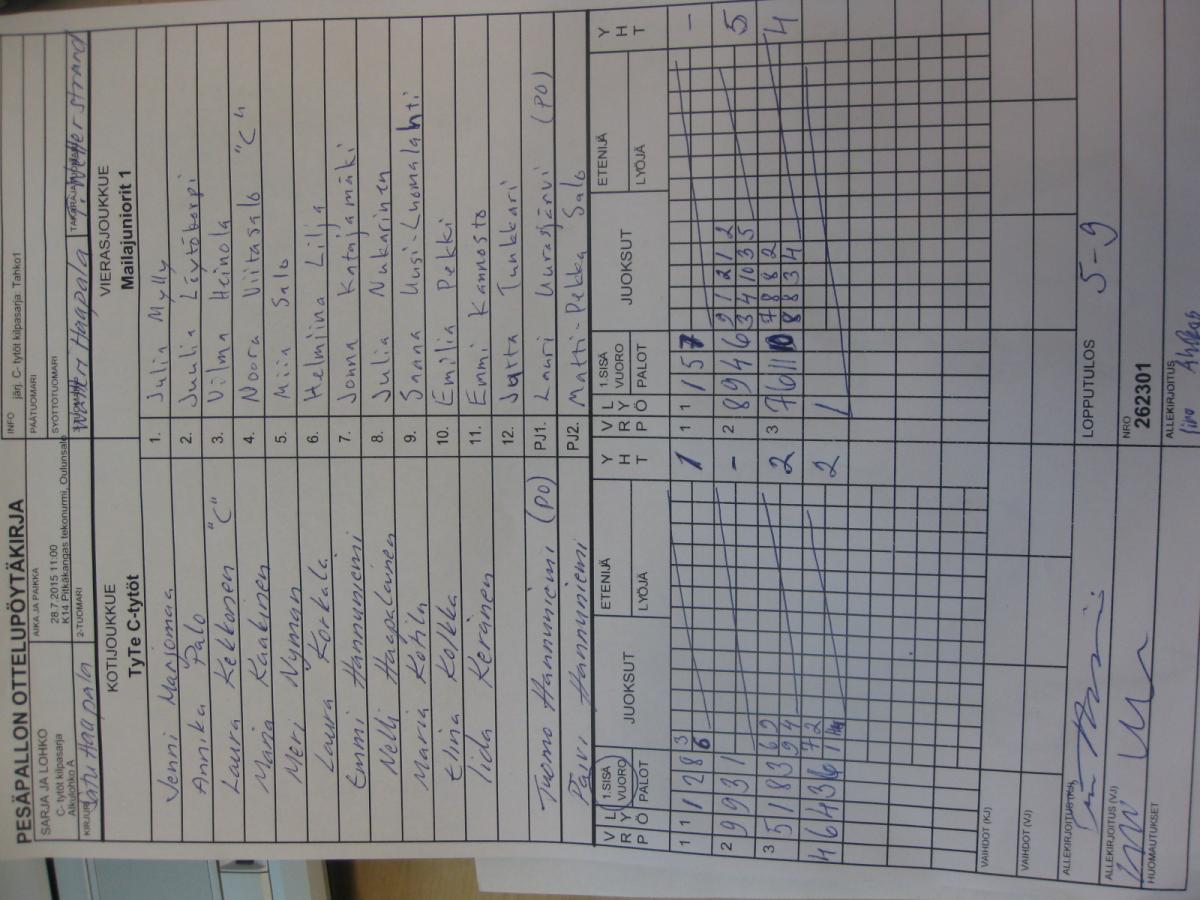 | C- tytöt kilpasarja - Alkulohko A | 26.7.2015 14:45 | K11 Oulunsalo kk | SMJ -99 | Espoo 1 | Mailajuniorit 1 |