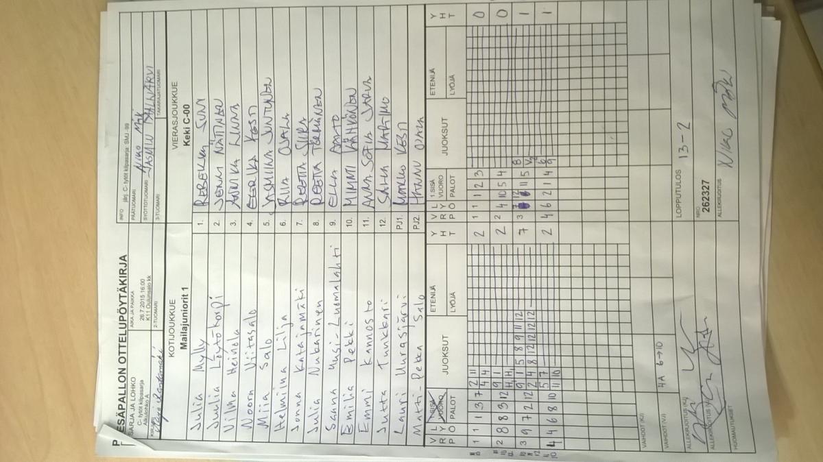 | C- tytöt kilpasarja - Alkulohko A | 28.7.2015 19:45 | K11 Oulunsalo kk | TyTe C-tytöt | Keki C-00 | Mailajuniorit 1 |