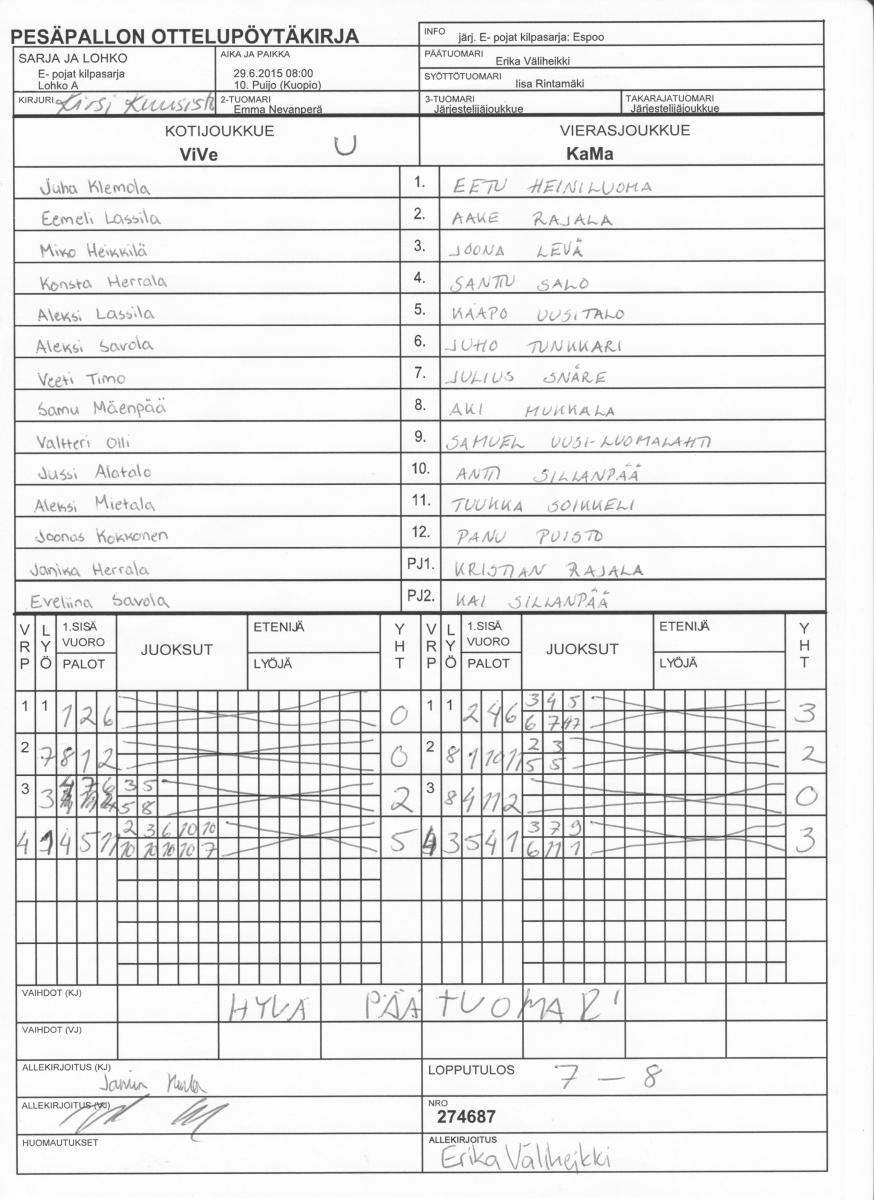 | E- pojat kilpasarja - Lohko A | 28.6.2015 13:00 | 10. Puijo (Kuopio) | NJ E-03 | ViVe | KaMa |