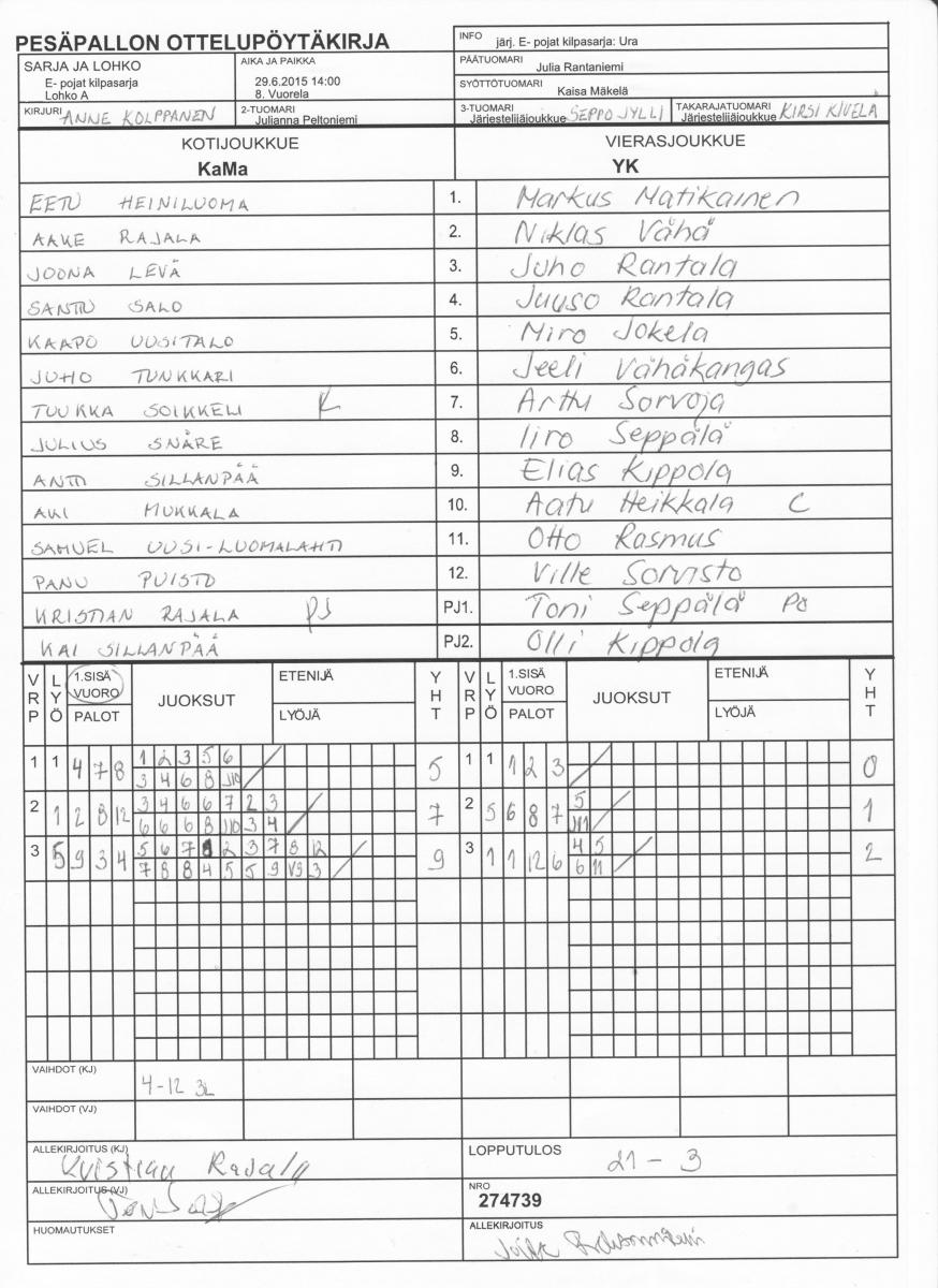 | E- pojat kilpasarja - Lohko A | 29.6.2015 09:00 | 10. Puijo (Kuopio) | Kiri white | Espoo | KaMa |