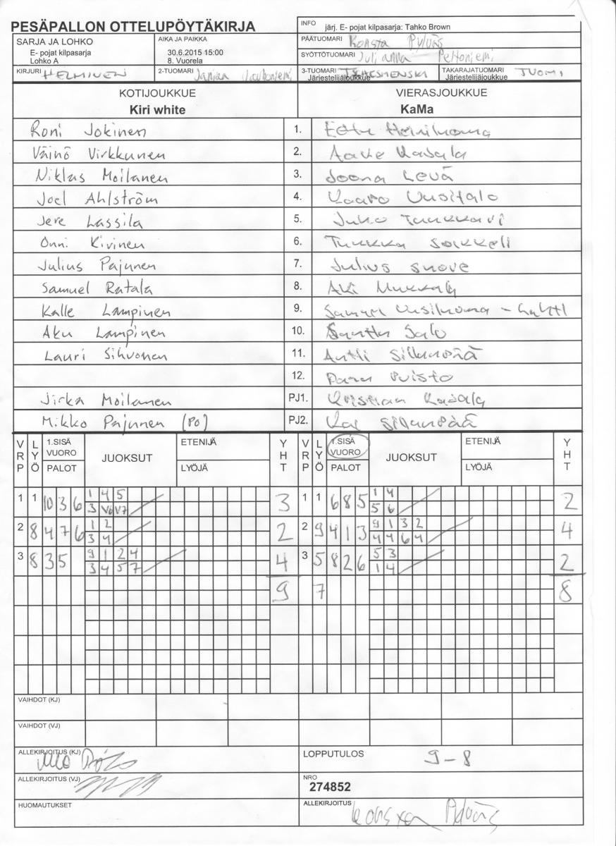 | E- pojat kilpasarja - Lohko A | 29.6.2015 18:00 | 8. Vuorela | Kiri white | NJ E-03 | KaMa |