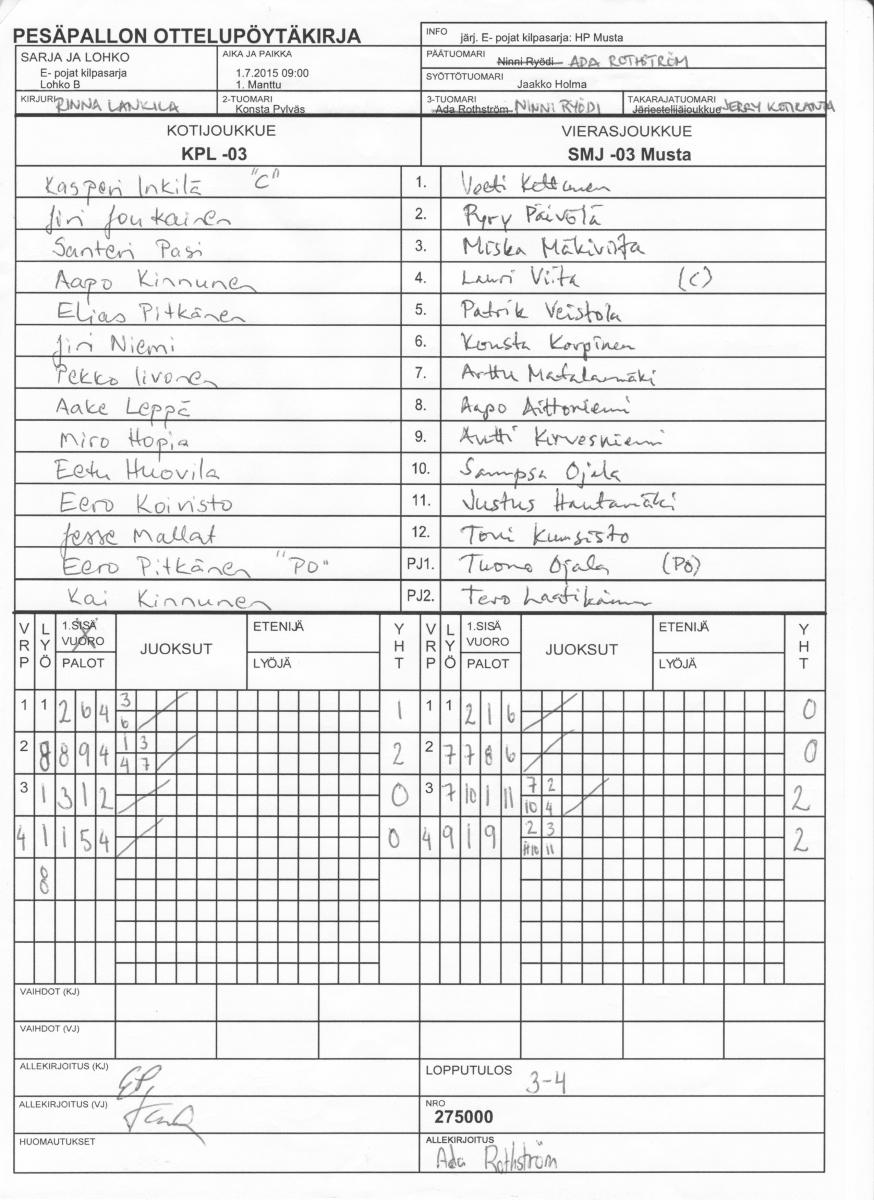 | E- pojat kilpasarja - Lohko B | 29.6.2015 20:00 | 1. Manttu | SiKi | KPL -03 | SMJ -03 Musta |