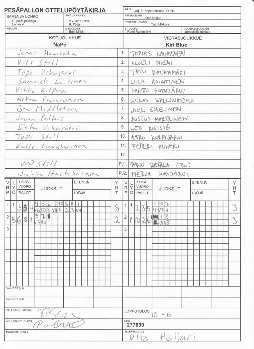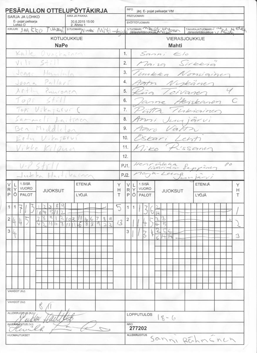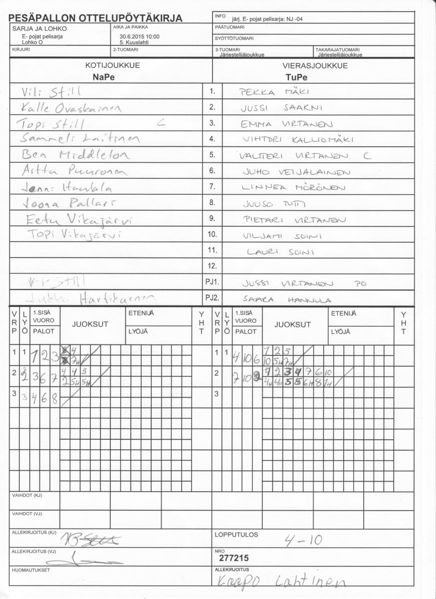 | Lohko O | 29.6.2015 18:00 | 7. Hamulan vanha kenttä | TuPe | Mahti | NaPe |