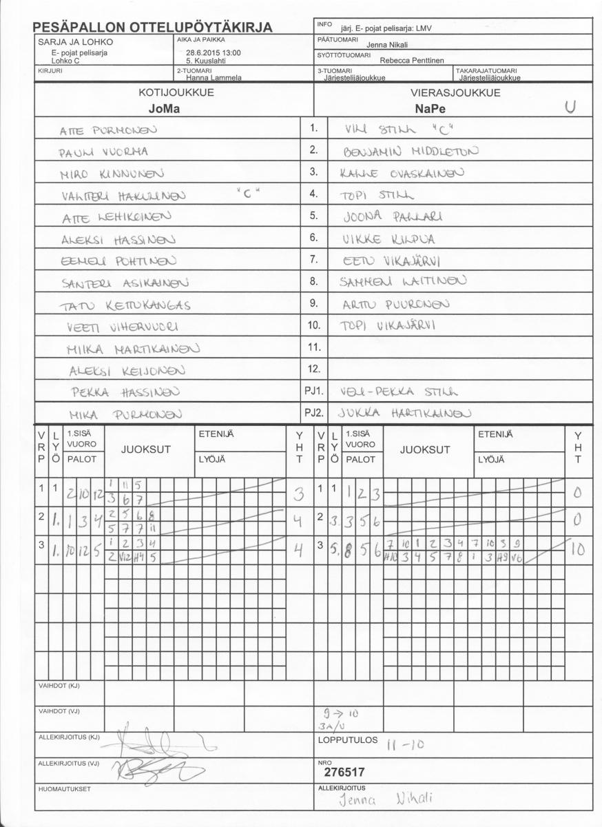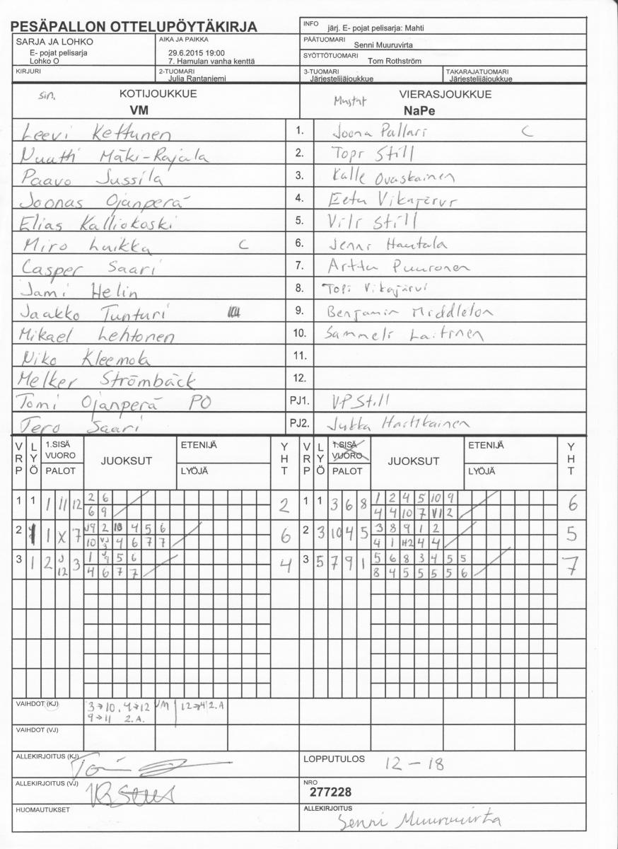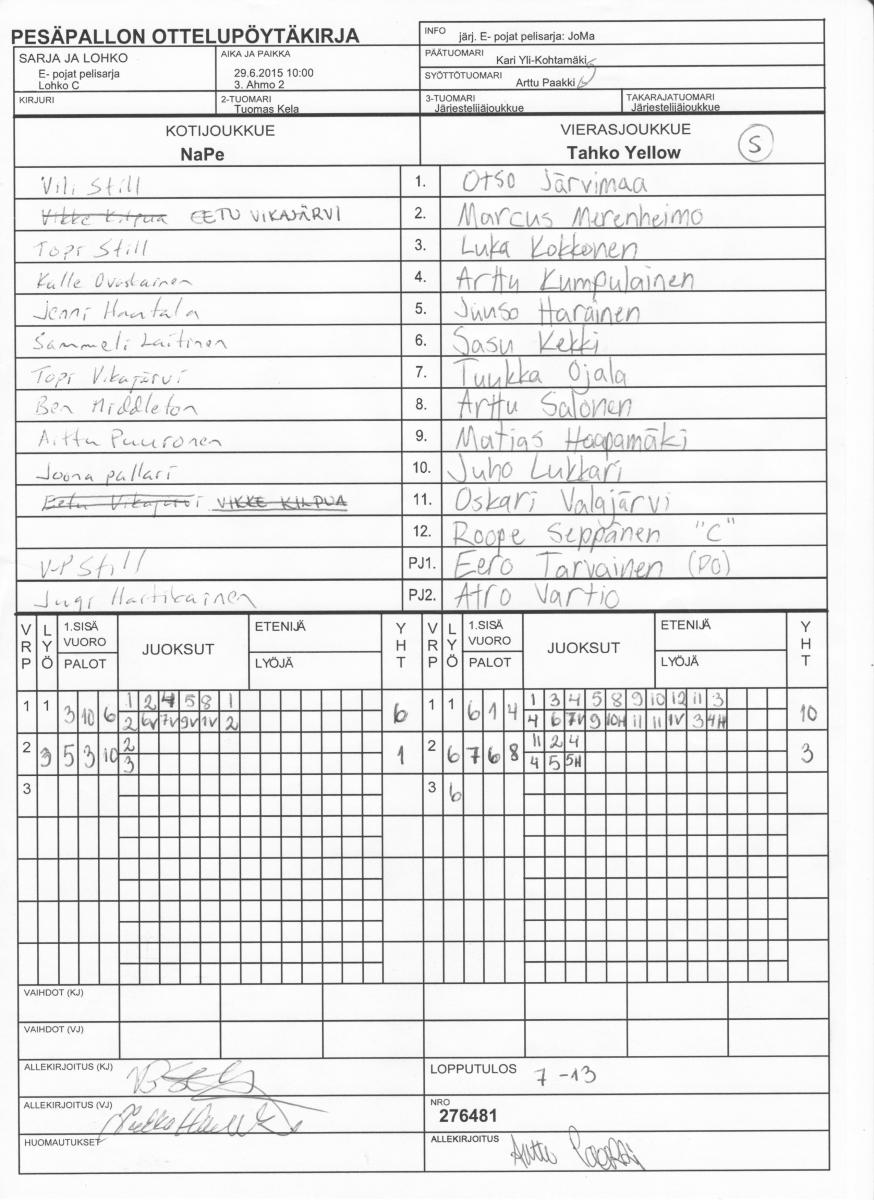 | Lohko O | 29.6.2015 18:00 | 7. Hamulan vanha kenttä | TuPe | Mahti | NaPe |