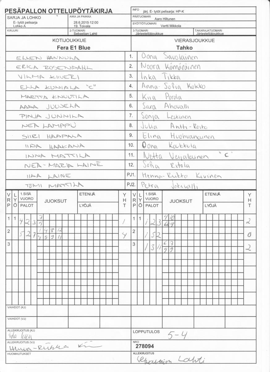 | E- tytöt pelisarja - Lohko A | 29.6.2015 19:00 | 18. Kasurila | Fera E1 Blue | IlU | Tahko |