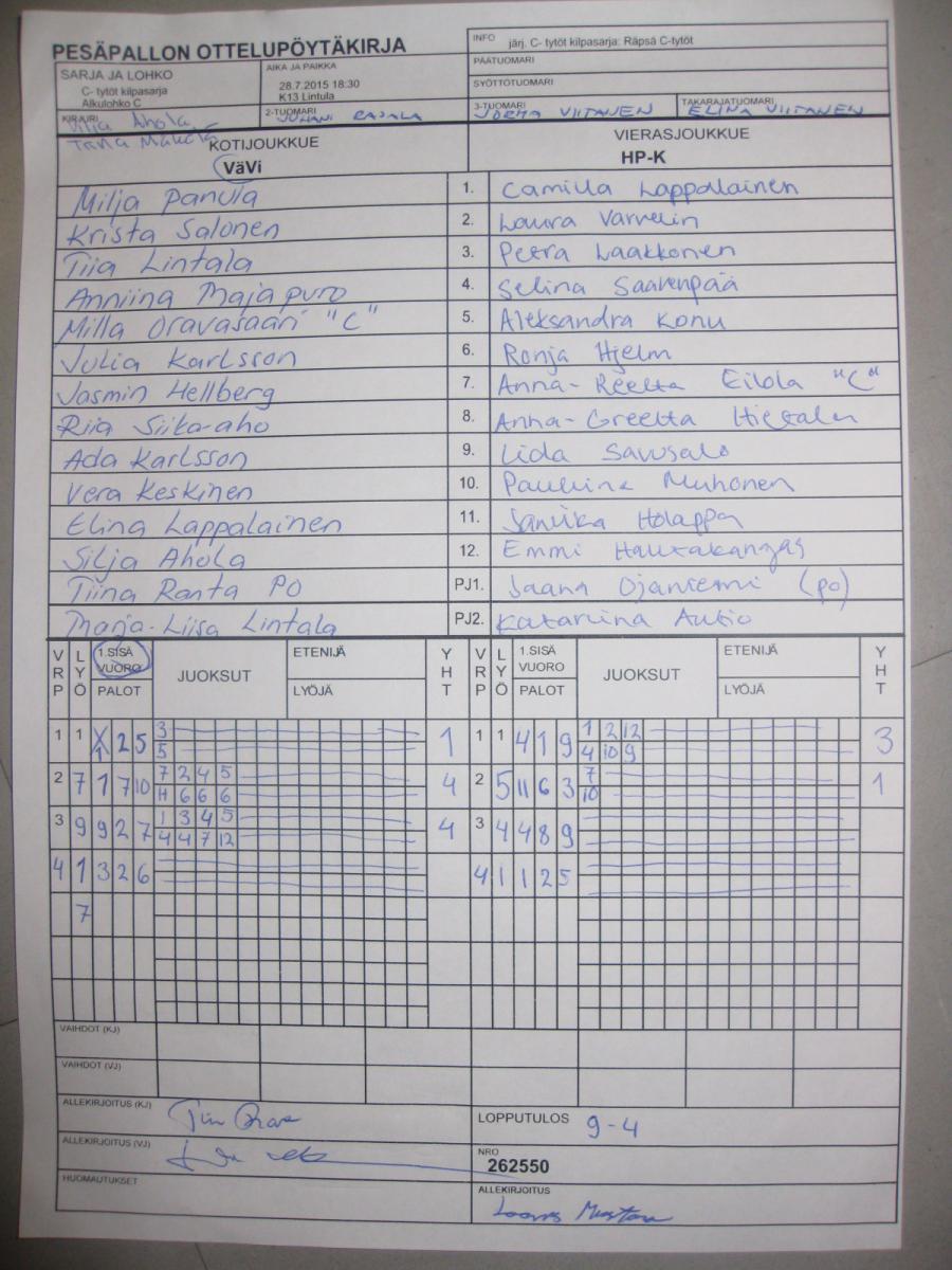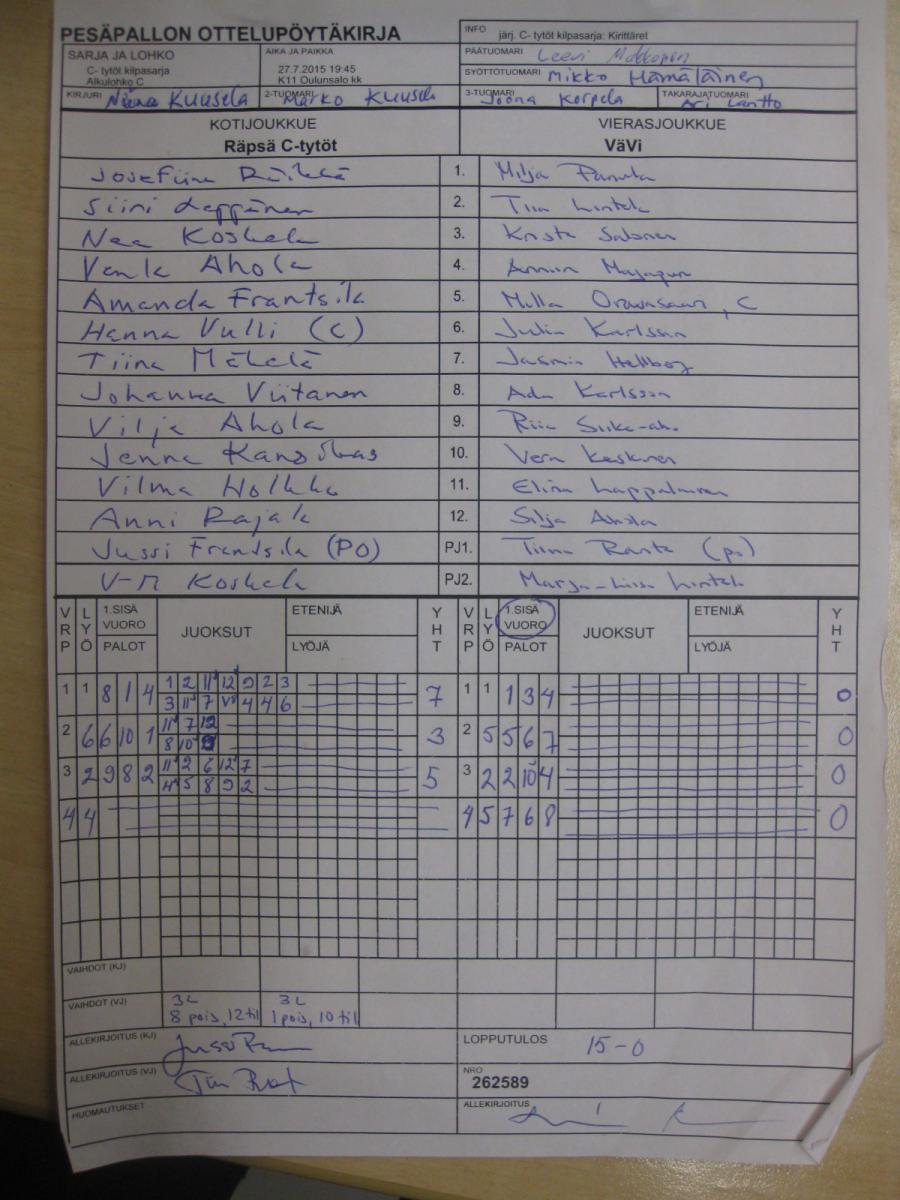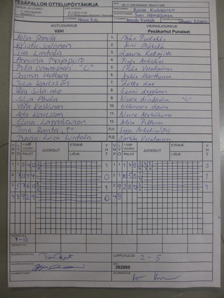 | C- tytöt kilpasarja - Alkulohko C | 26.7.2015 14:45 | K13 Lintula | Pesäkarhut Punaiset | HP-K | VäVi |