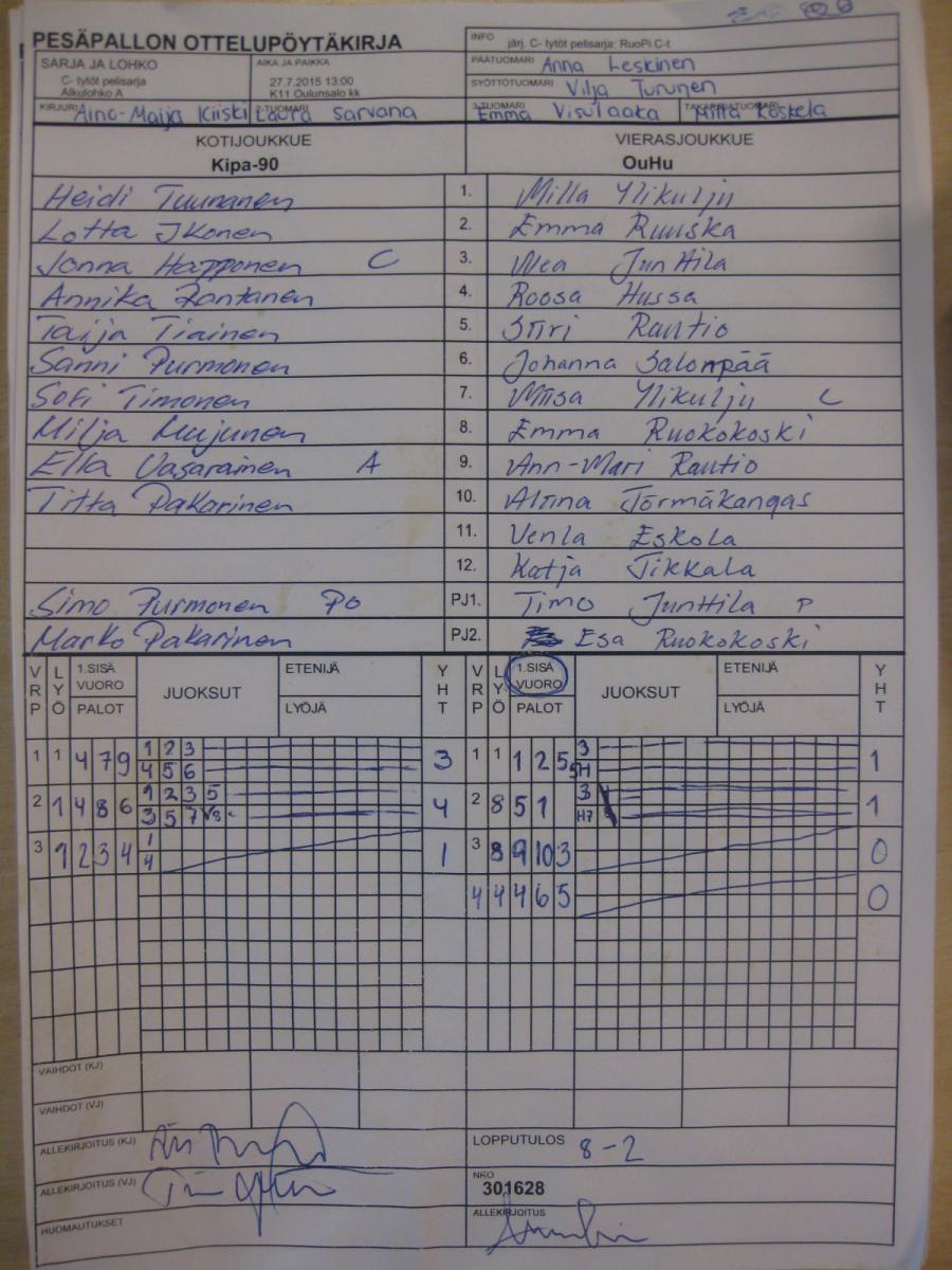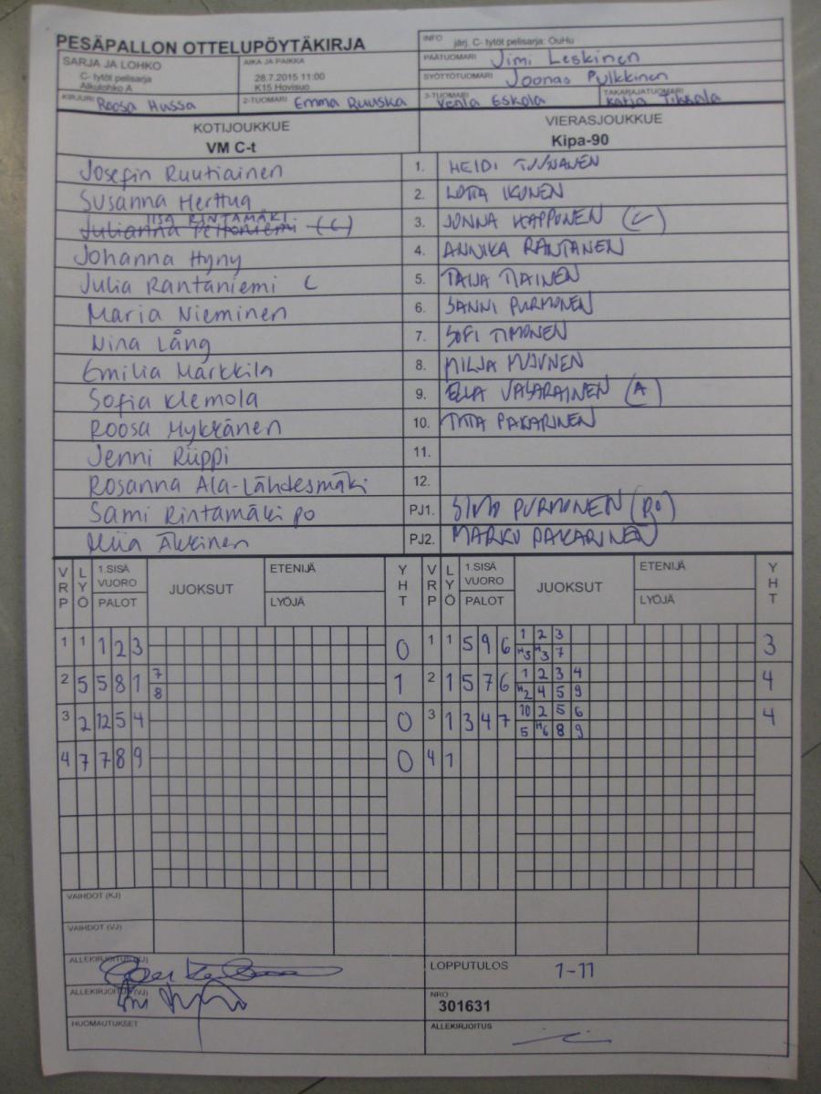 | C- tytöt pelisarja - Alkulohko A | 28.7.2015 15:30 | K11 Oulunsalo kk | OuHu | VM C-t | Kipa-90 |