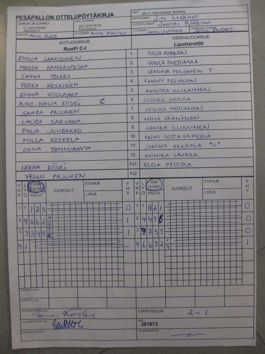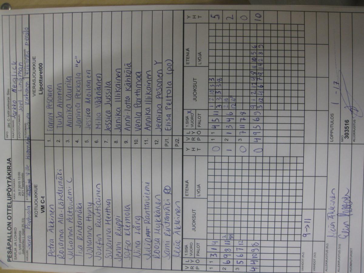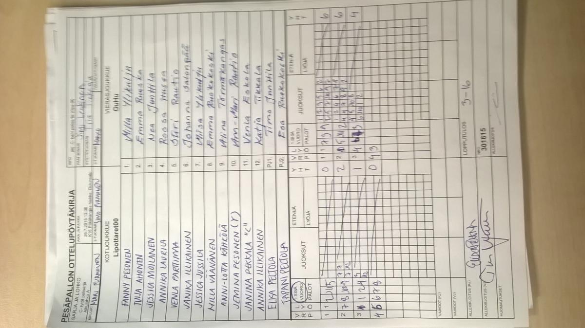 | C- tytöt pelisarja - Alkulohko A | 26.7.2015 14:45 | K16 Pitkäkangas hiekka, Oulunsalo | Kipa-90 | RuoPi C-t | Lipottaret00 |