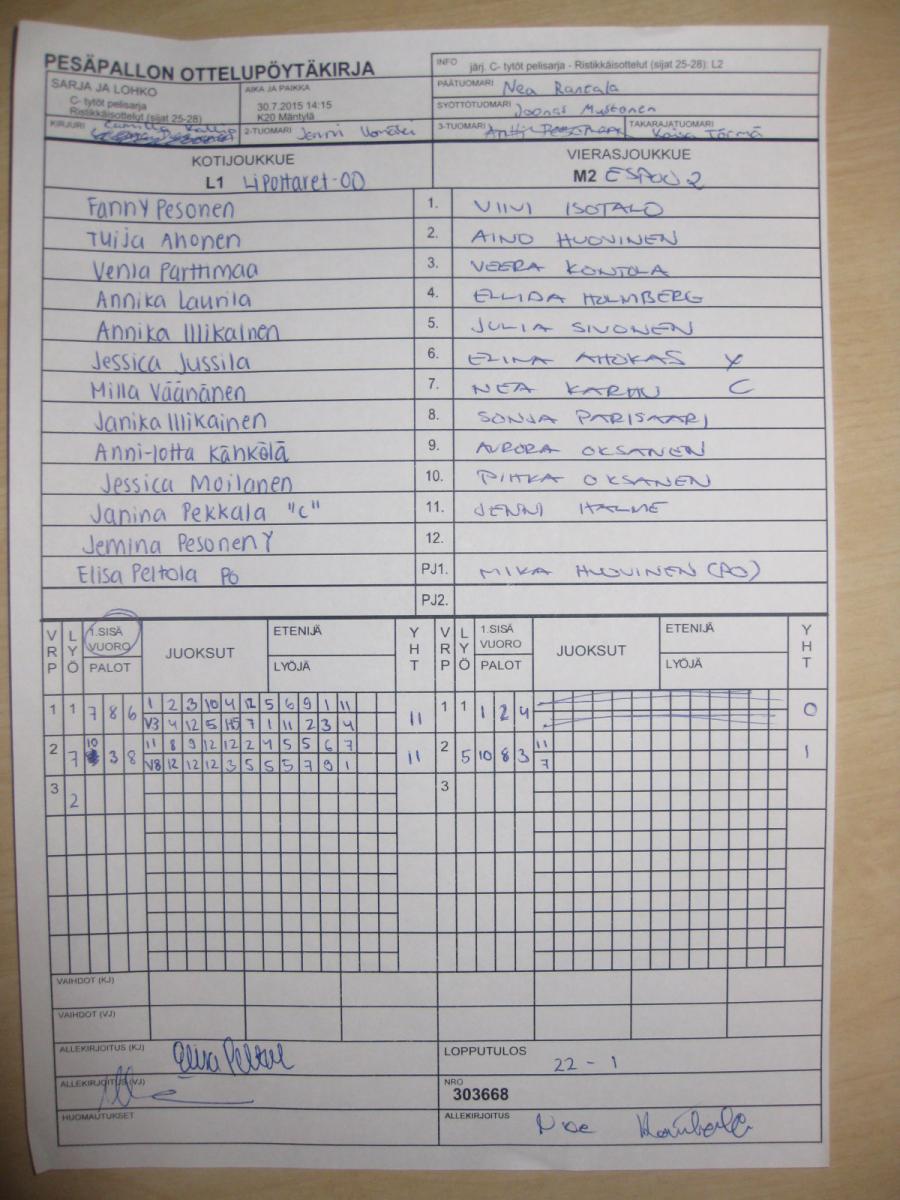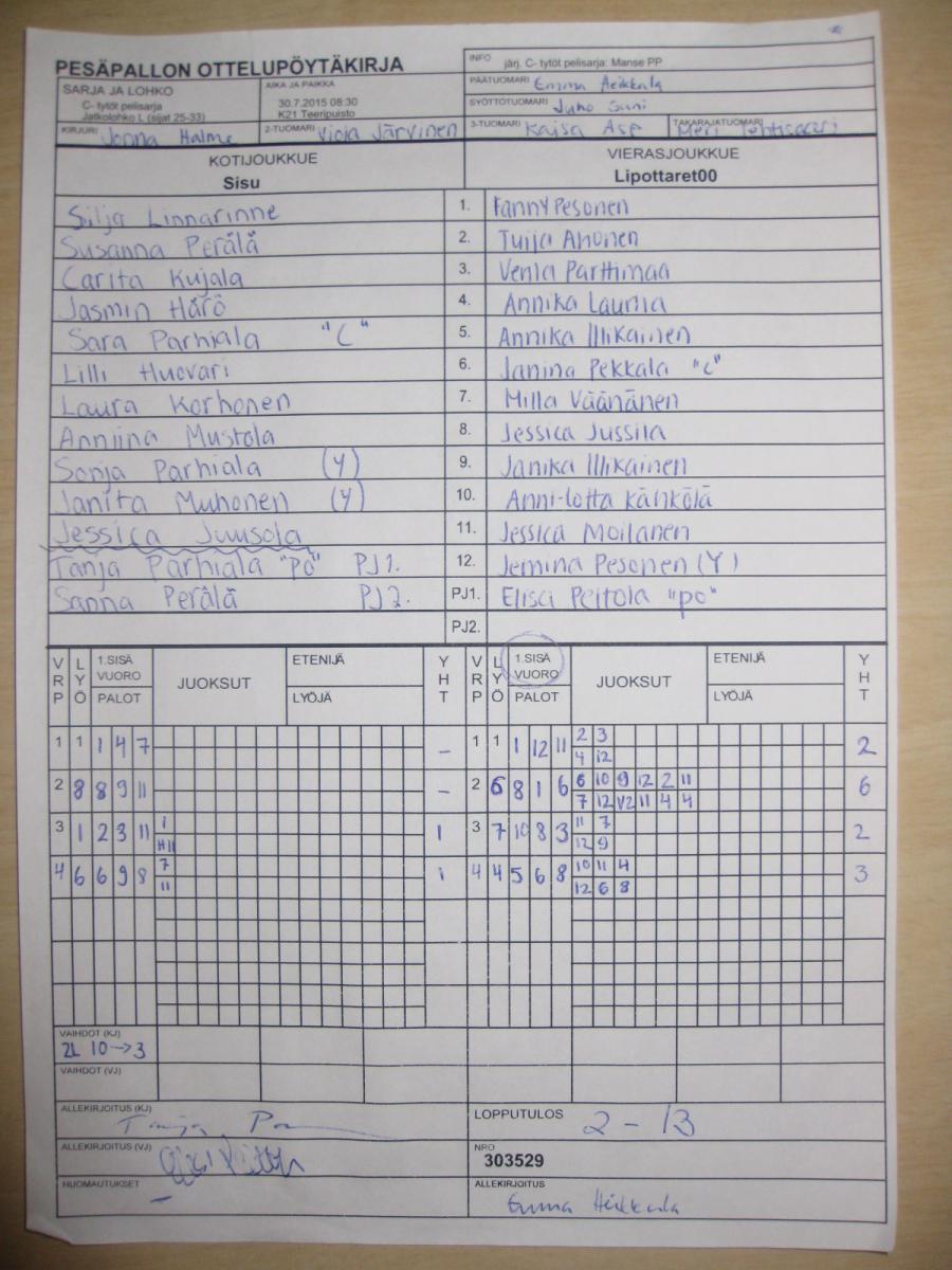 | Jatkolohko L (sijat 25-33) | 29.7.2015 14:15 | K21 Teeripuisto | Manse PP | Sisu | Lipottaret00 |