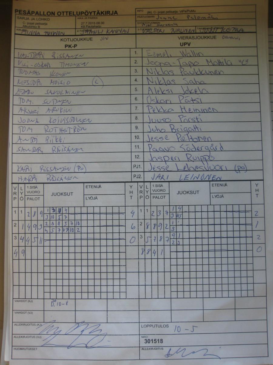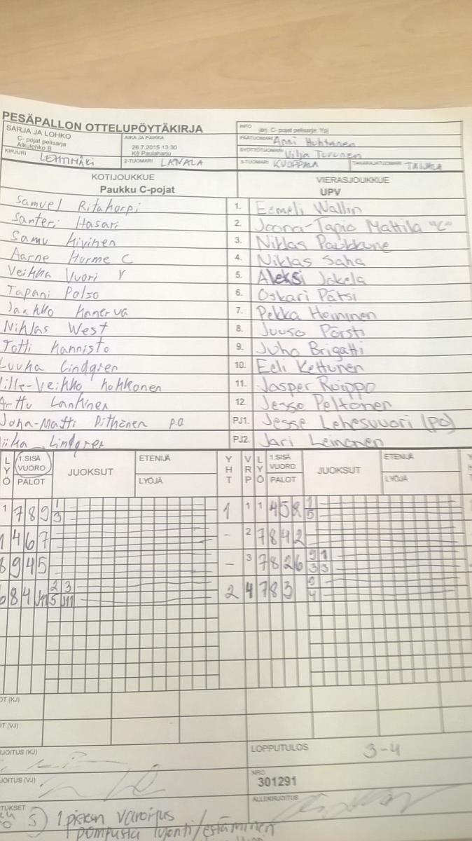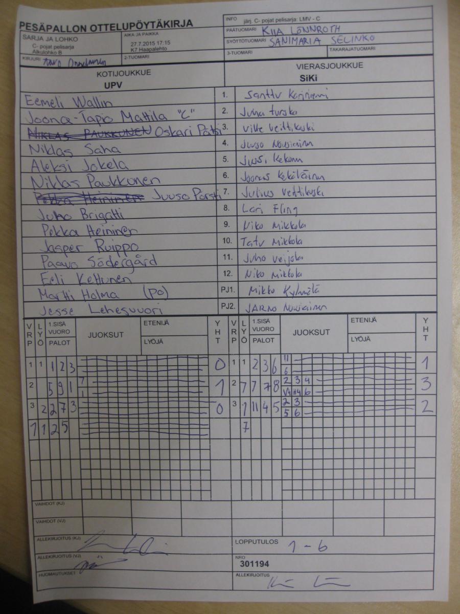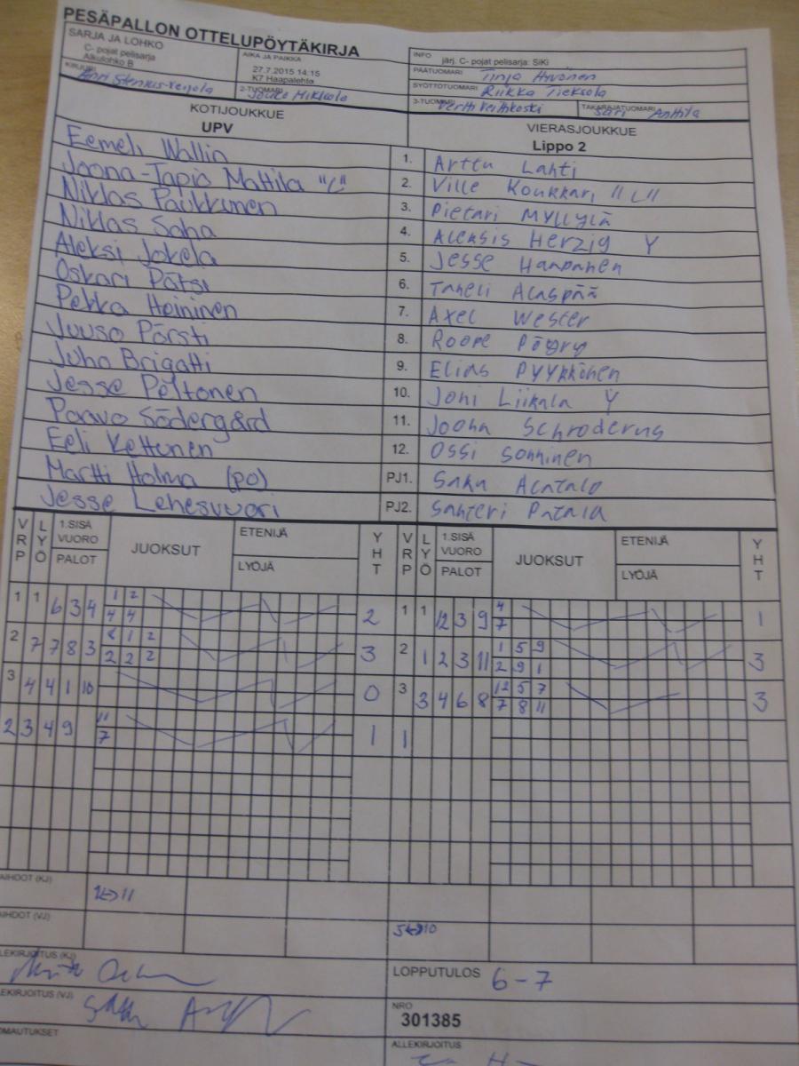 | Alkulohko A | 27.7.2015 18:30 | K7 Haapalehto | LMV - C | LP-jun | UPV |