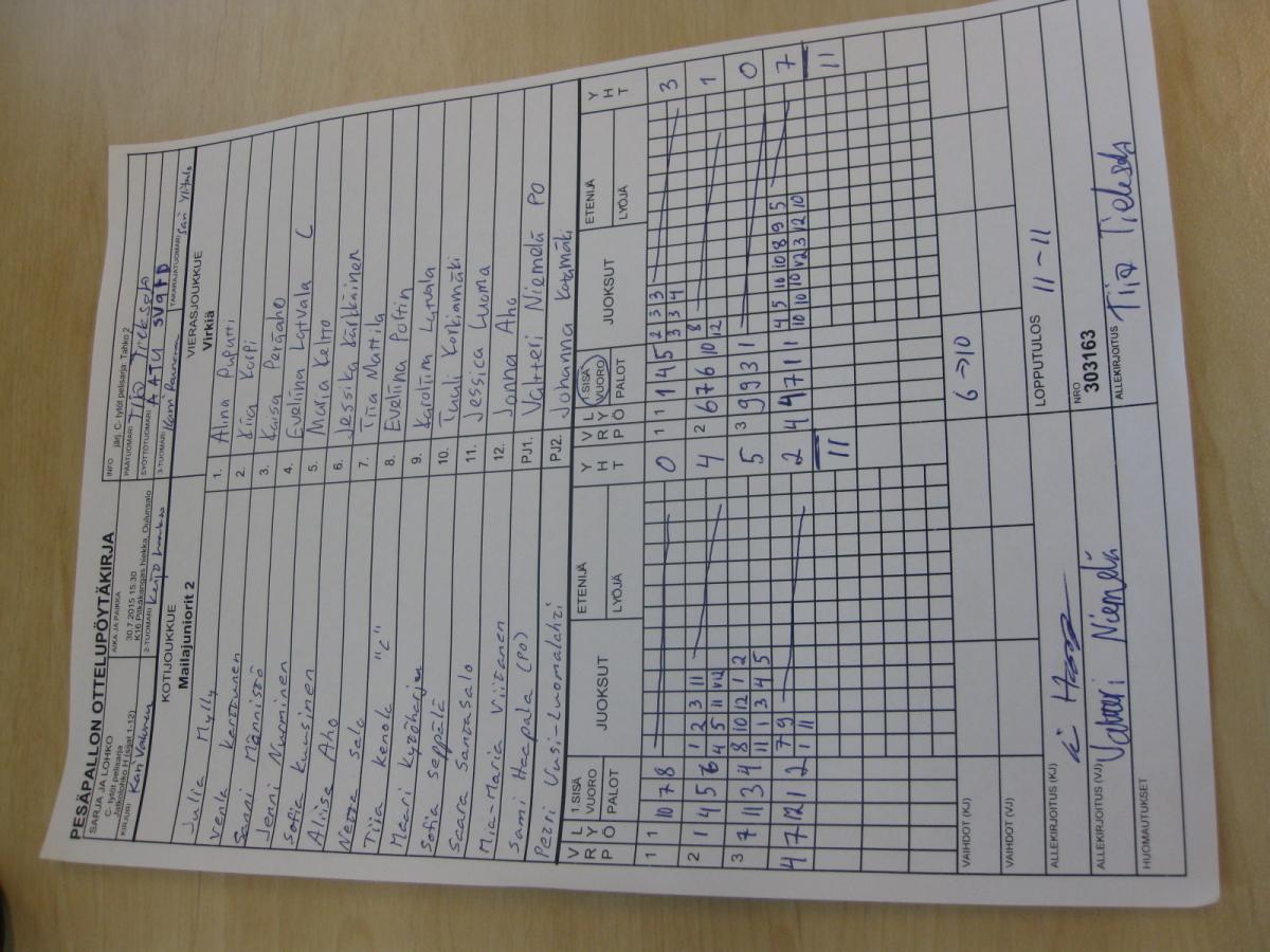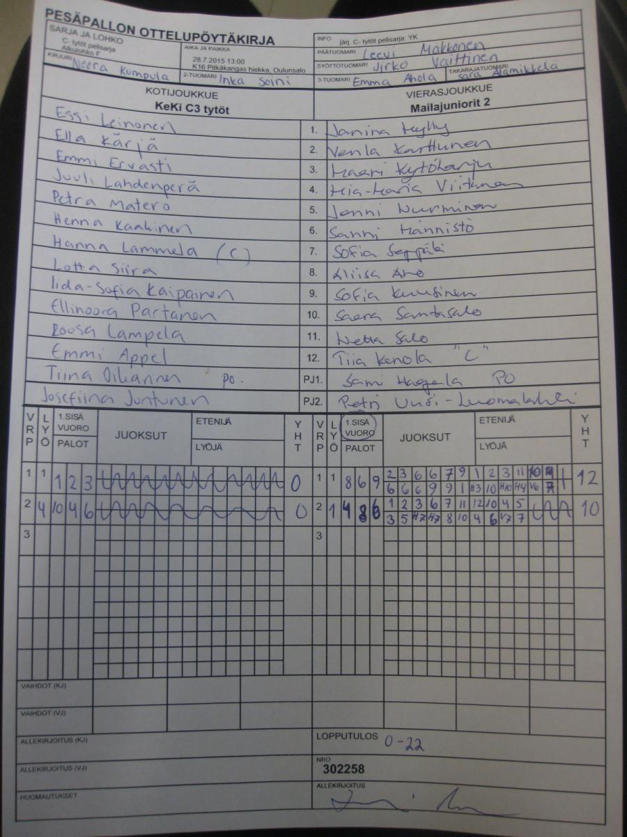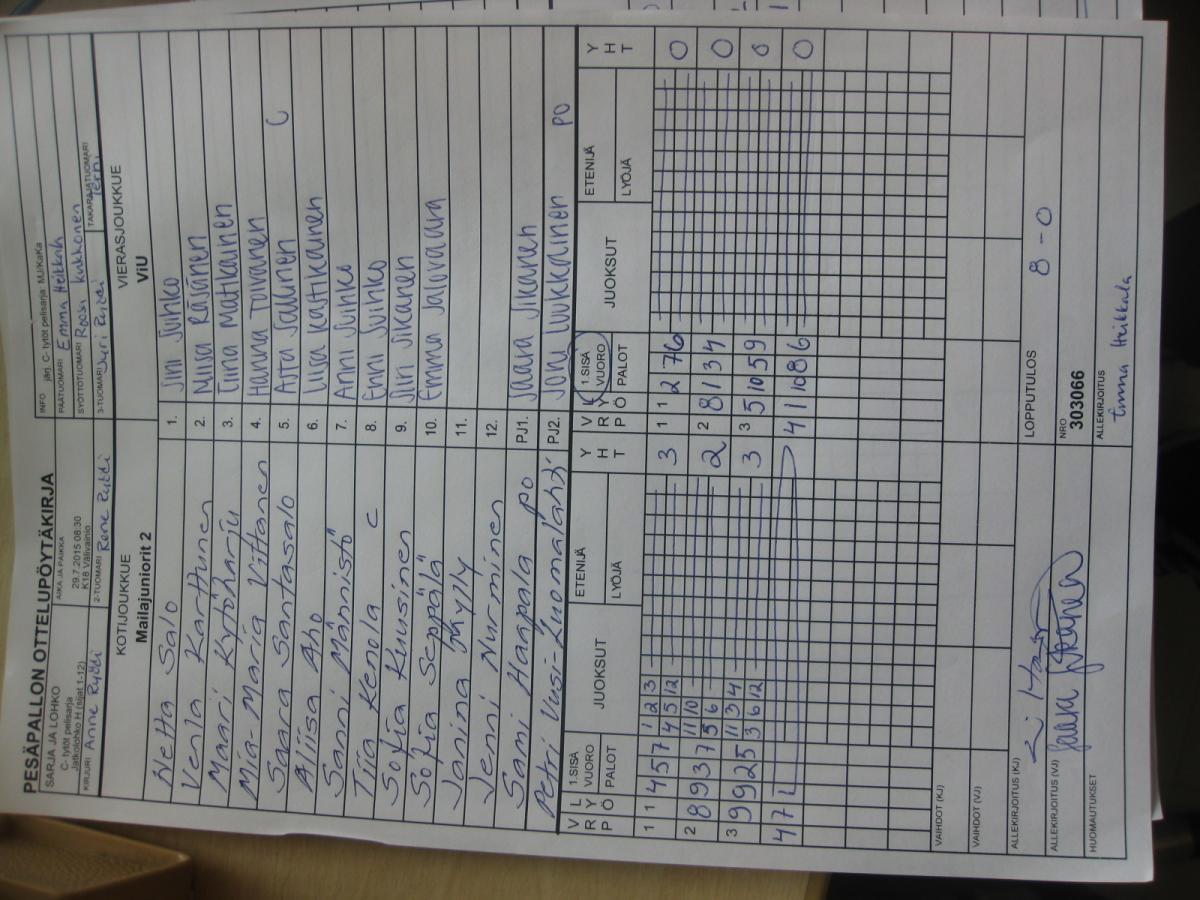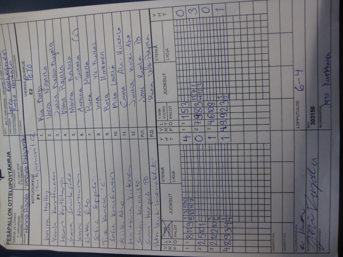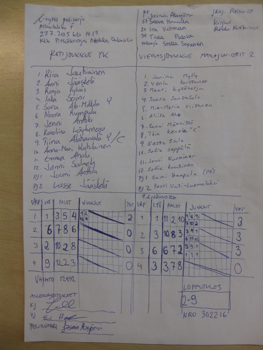 | Alkulohko F | 28.7.2015 14:15 | K16 Pitkäkangas hiekka, Oulunsalo | Roihu C-tytöt | YK | Mailajuniorit 2 |