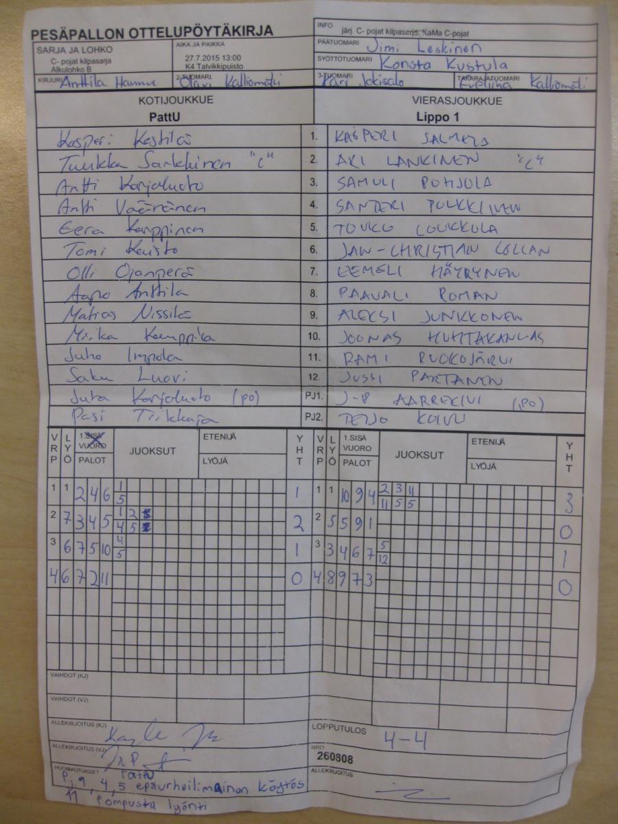 | C- pojat kilpasarja - Alkulohko B | 29.7.2015 13:00 | K1 Stadion Oulu | KoU-00 | PattU | Lippo 1 |