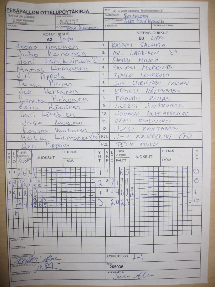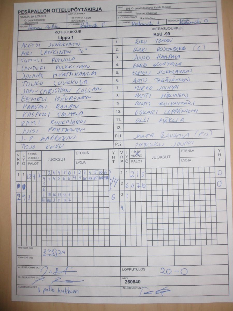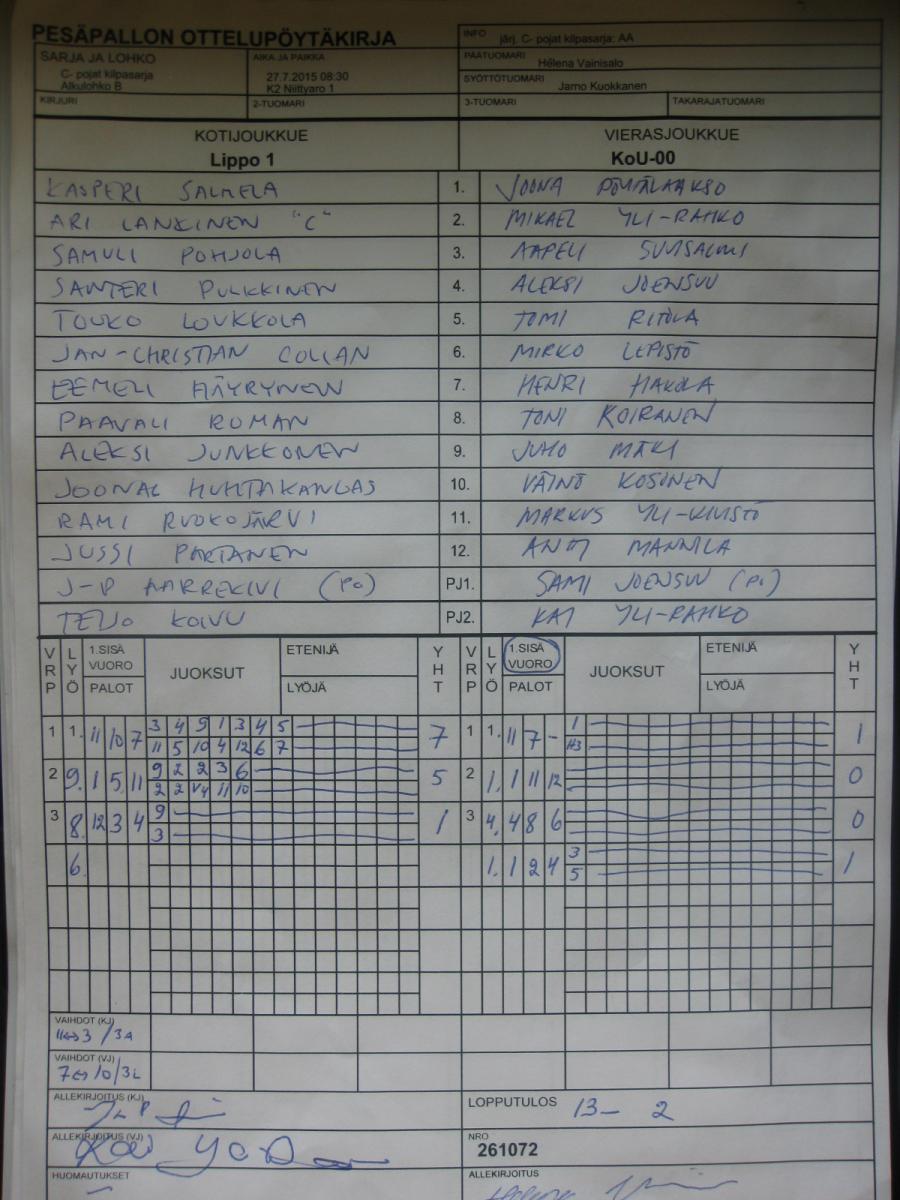 | Ristikkäisottelut | 30.7.2015 13:00 | K2 Niittyaro 1 | SMJ P00 | KoU-00 | Lippo 1 |