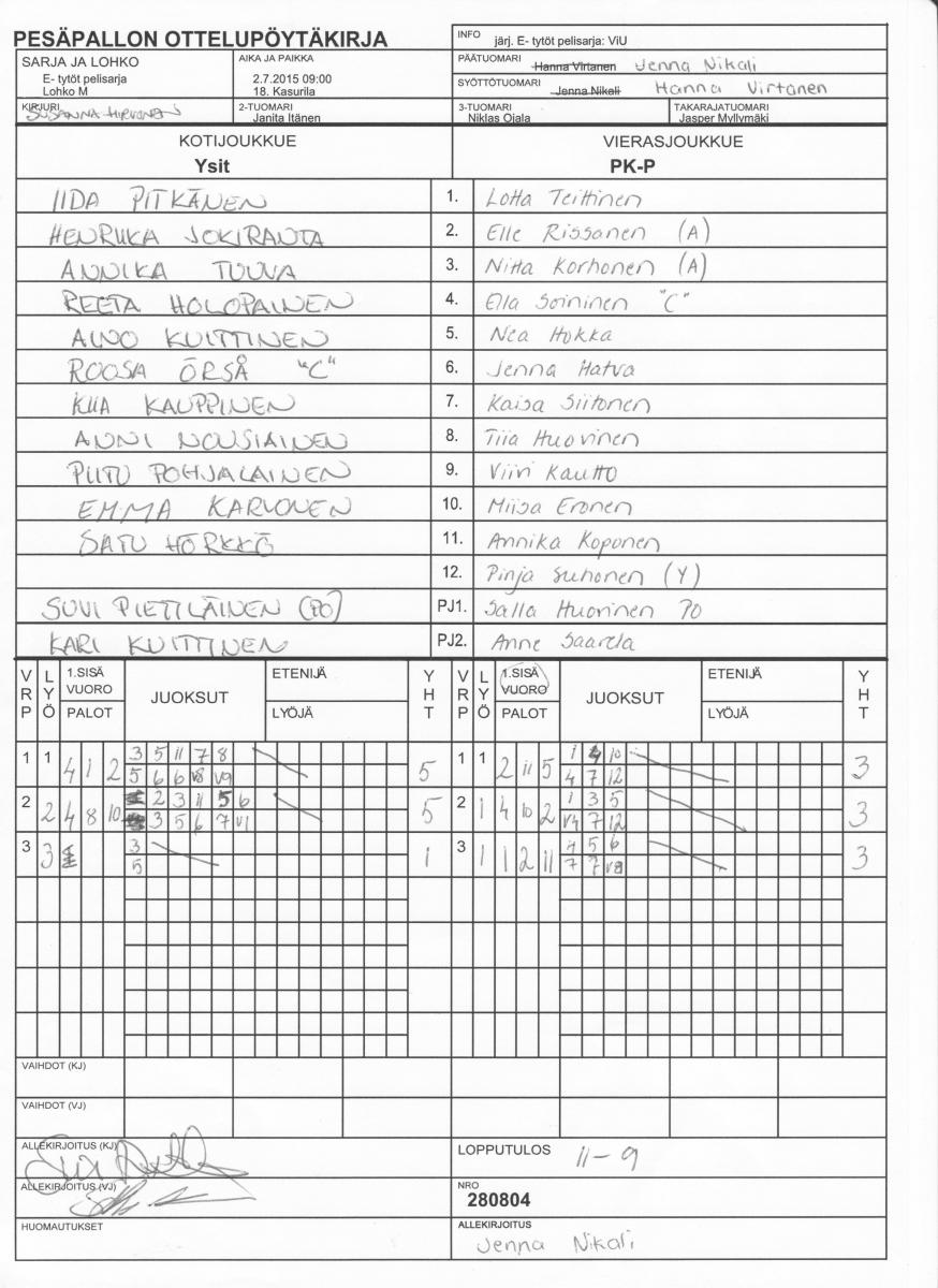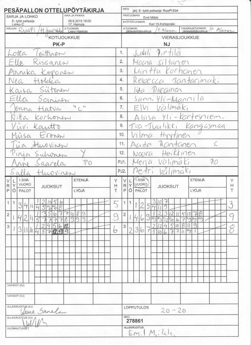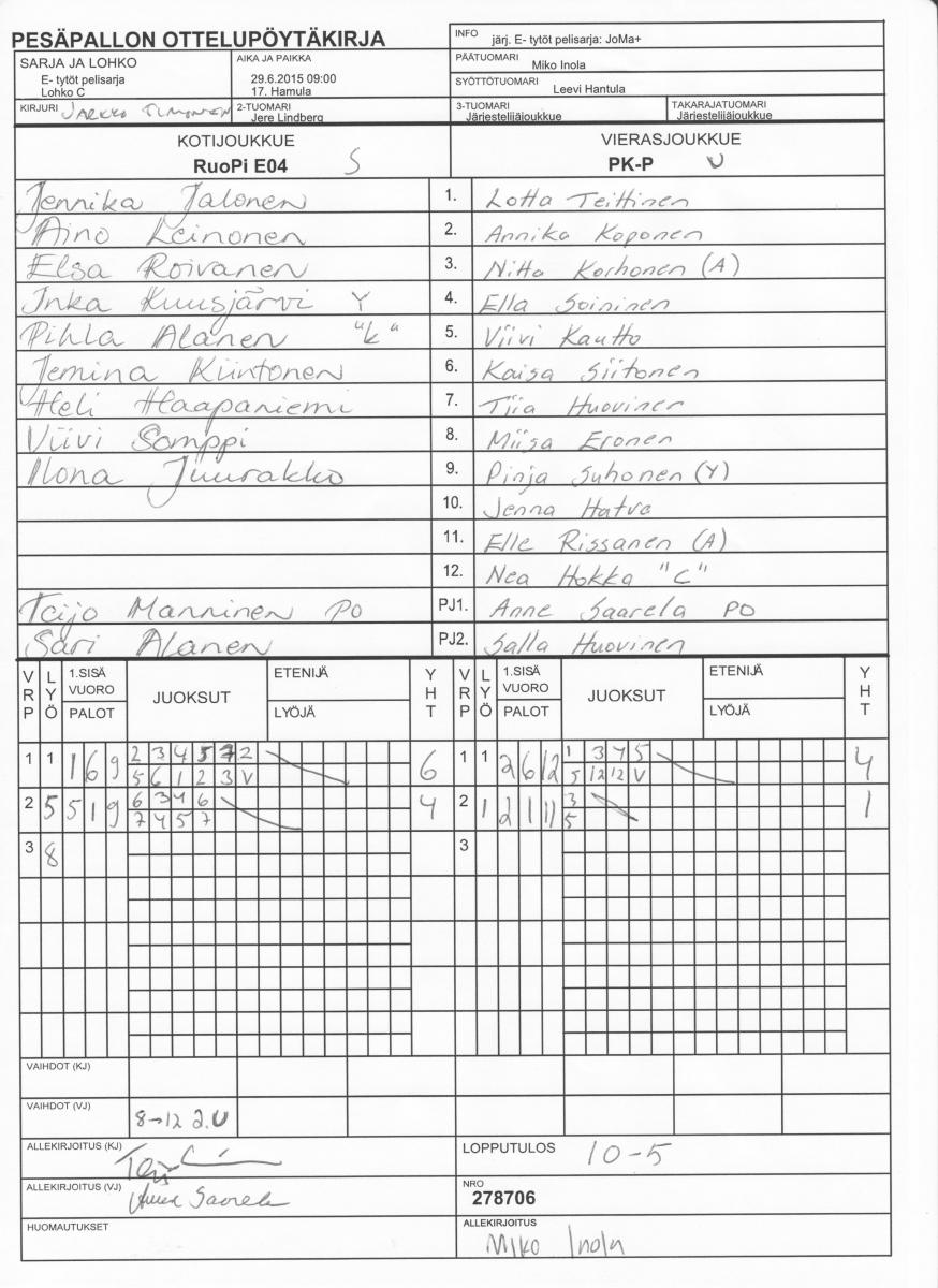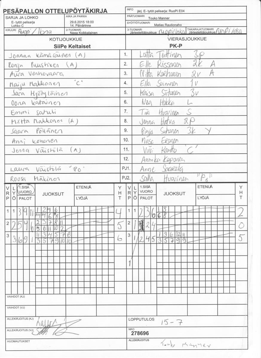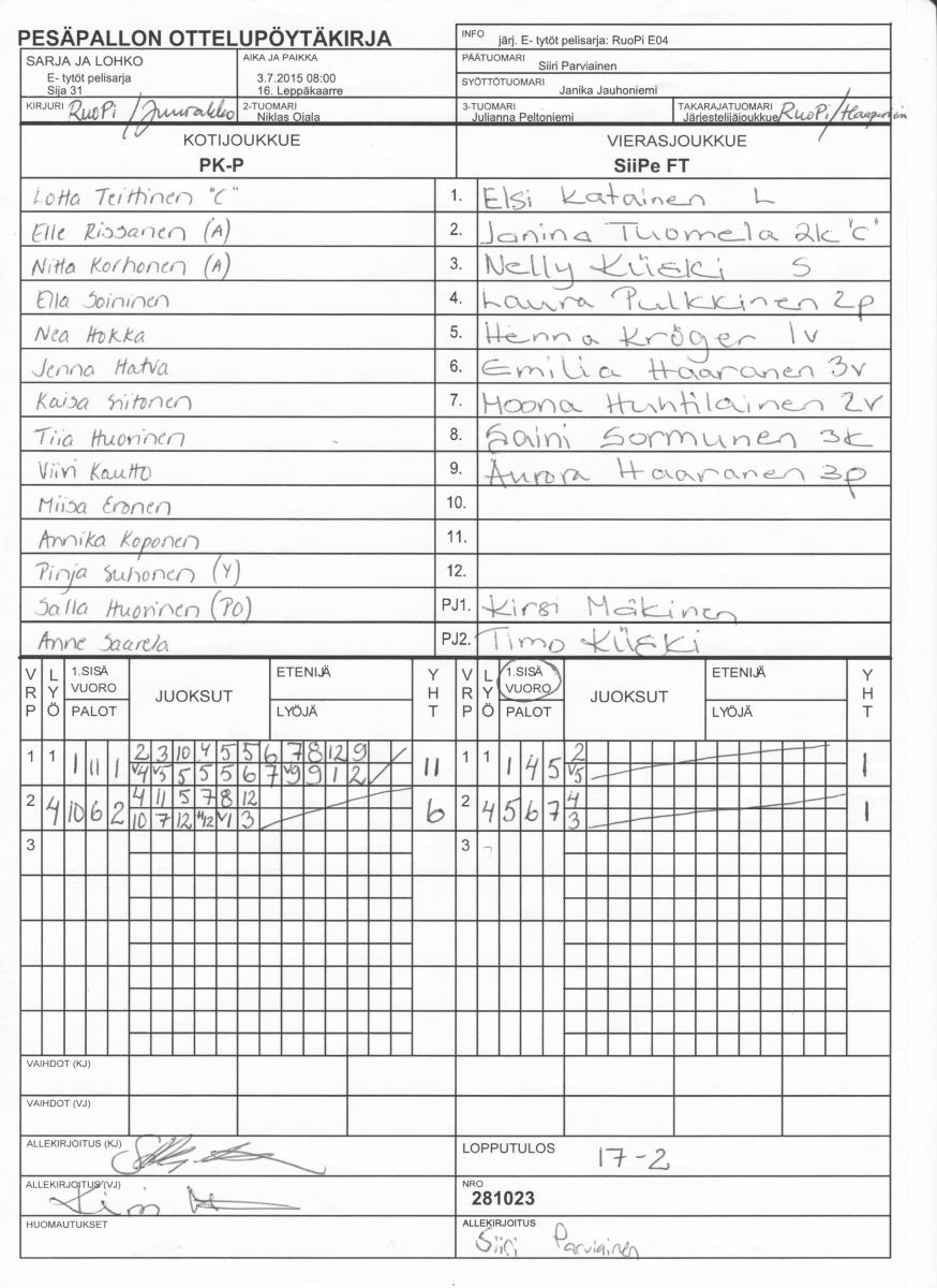 | E- tytöt pelisarja - Lohko C | 29.6.2015 19:00 | 14. Päivärinne | RuoPi E04 | NJ | PK-P |