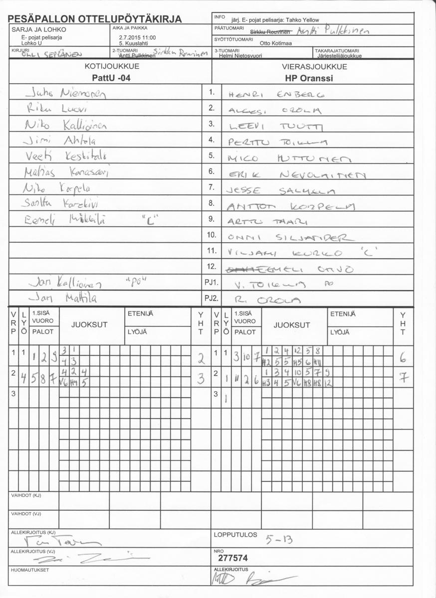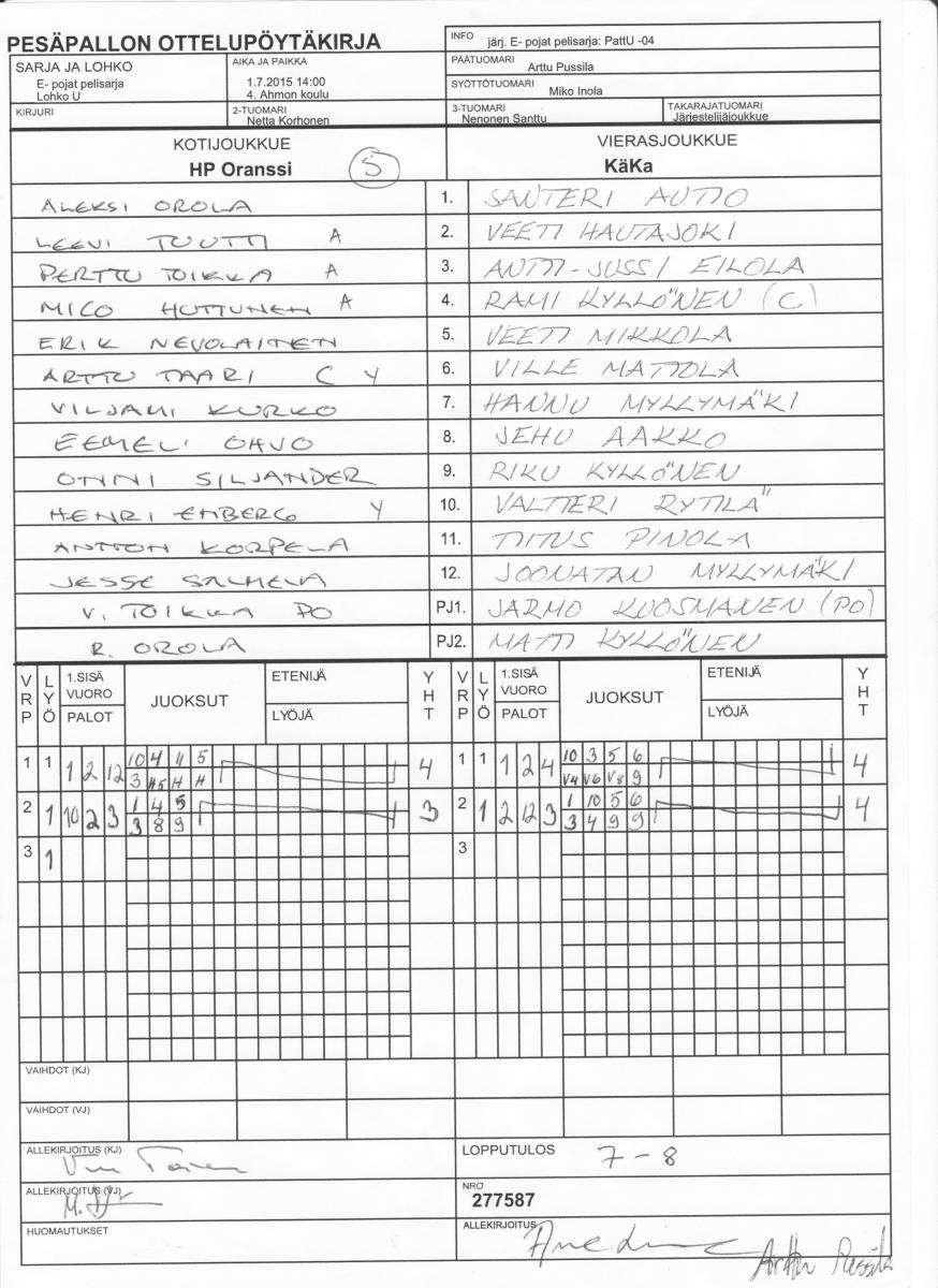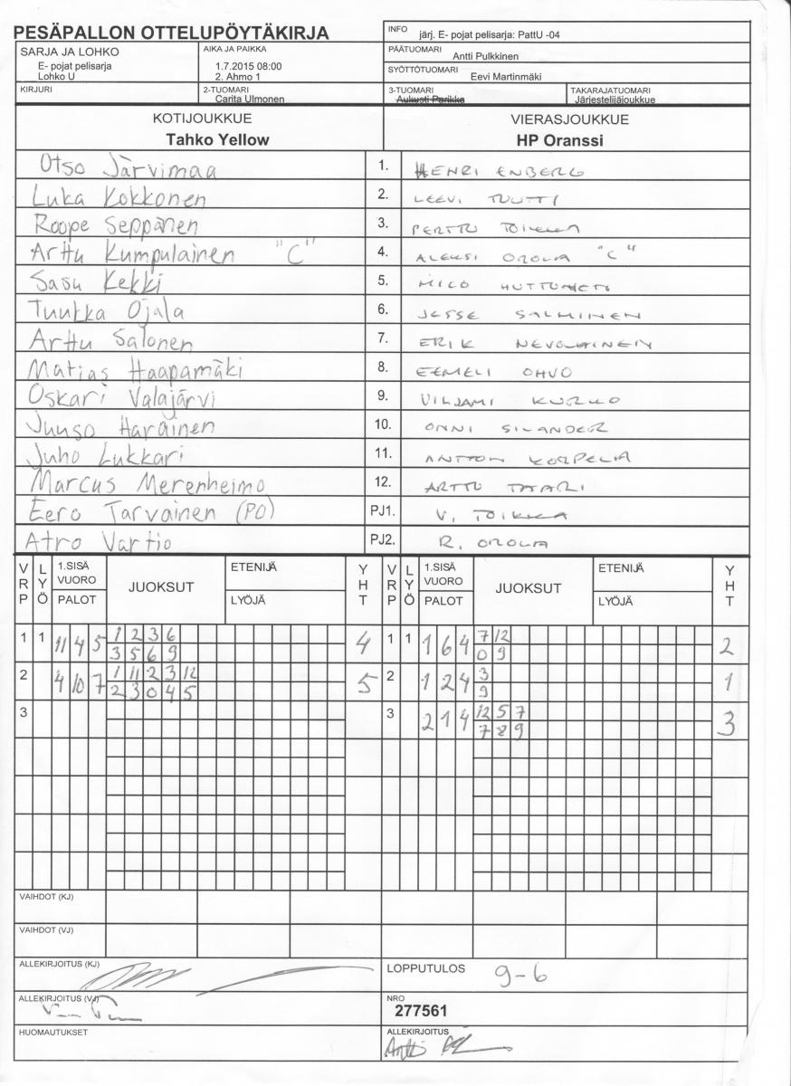 | Lohko U | 1.7.2015 13:00 | 4. Ahmon koulu | PattU -04 | Tahko Yellow | HP Oranssi |