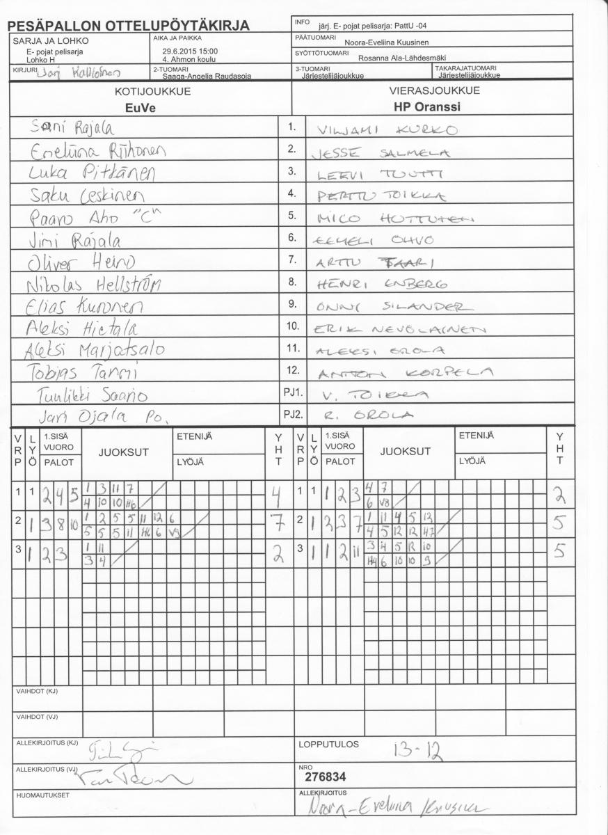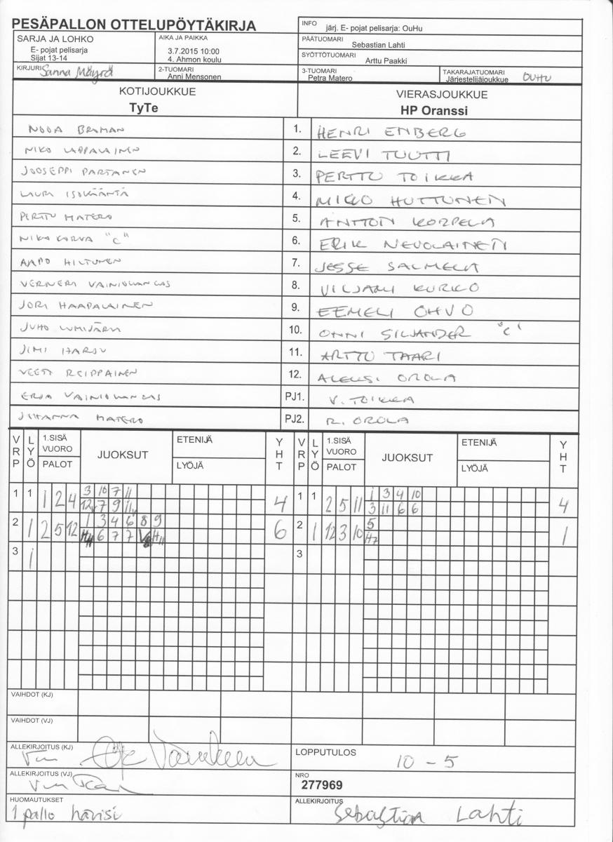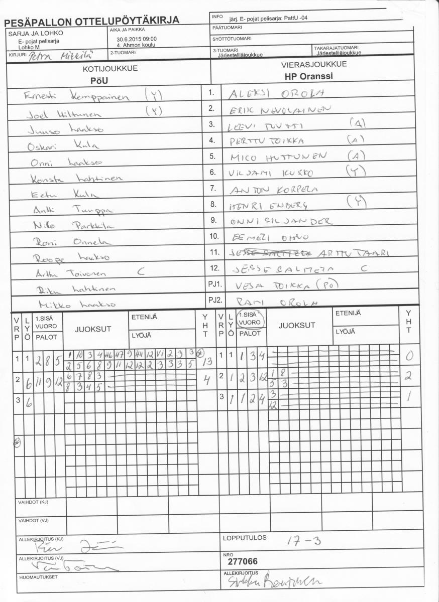 | Lohko U | 1.7.2015 13:00 | 4. Ahmon koulu | PattU -04 | Tahko Yellow | HP Oranssi |