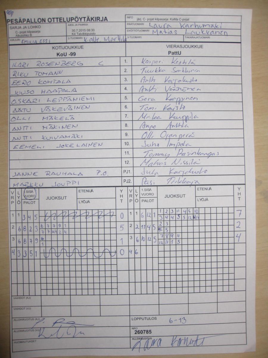 | C- pojat kilpasarja - Alkulohko B | 26.7.2015 14:45 | K4 Talvikkipuisto | KoU -99 | PuPe | PattU |