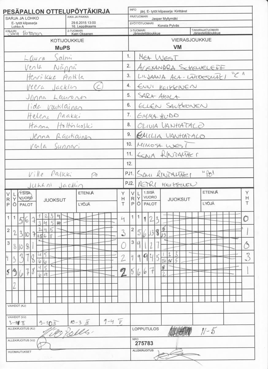 | E- tytöt kilpasarja - Lohko A | 28.6.2015 18:00 | 11. POP Areena 1 | VM | Fera E1 White | MuPS |
