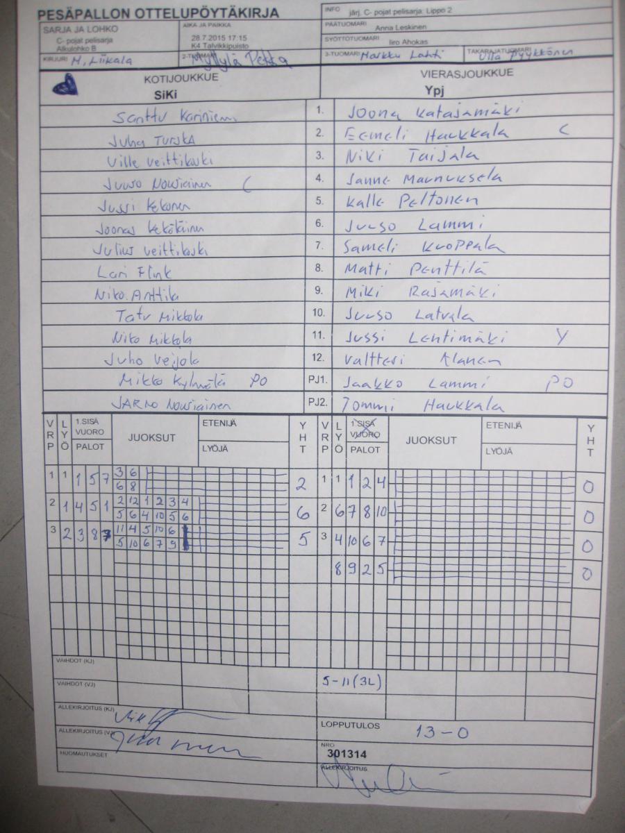 | 28.7.2015 17:15 | K4 Talvikkipuisto | SiKi | Ypj | 13-0 | näytä |