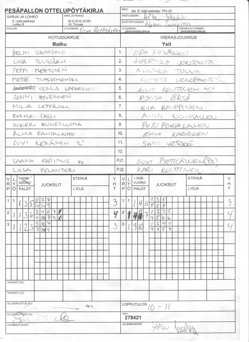 | E- tytöt pelisarja - Lohko B | 29.6.2015 19:00 | 19. Toivala | HP | Roihu | Ysit |