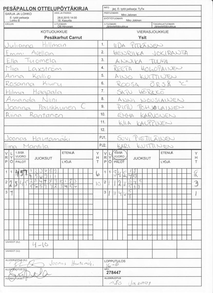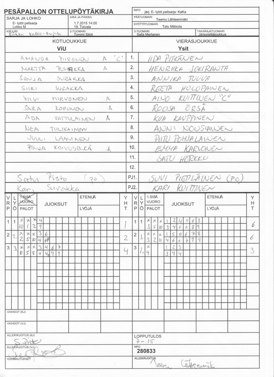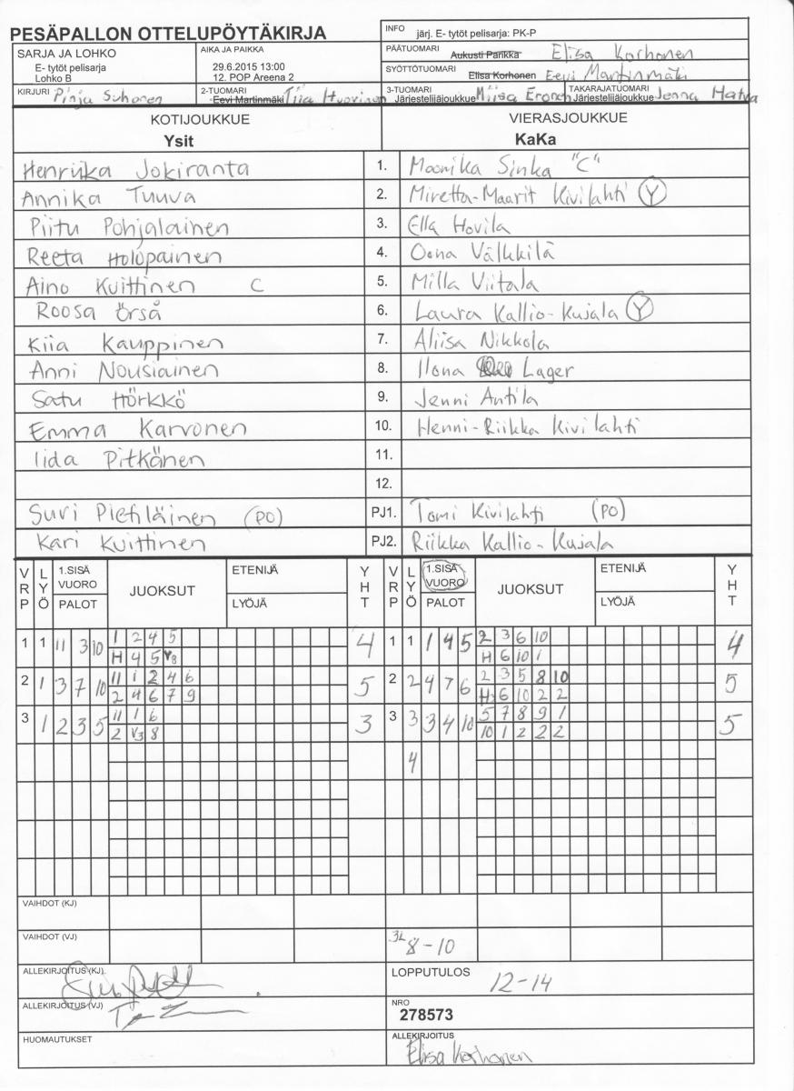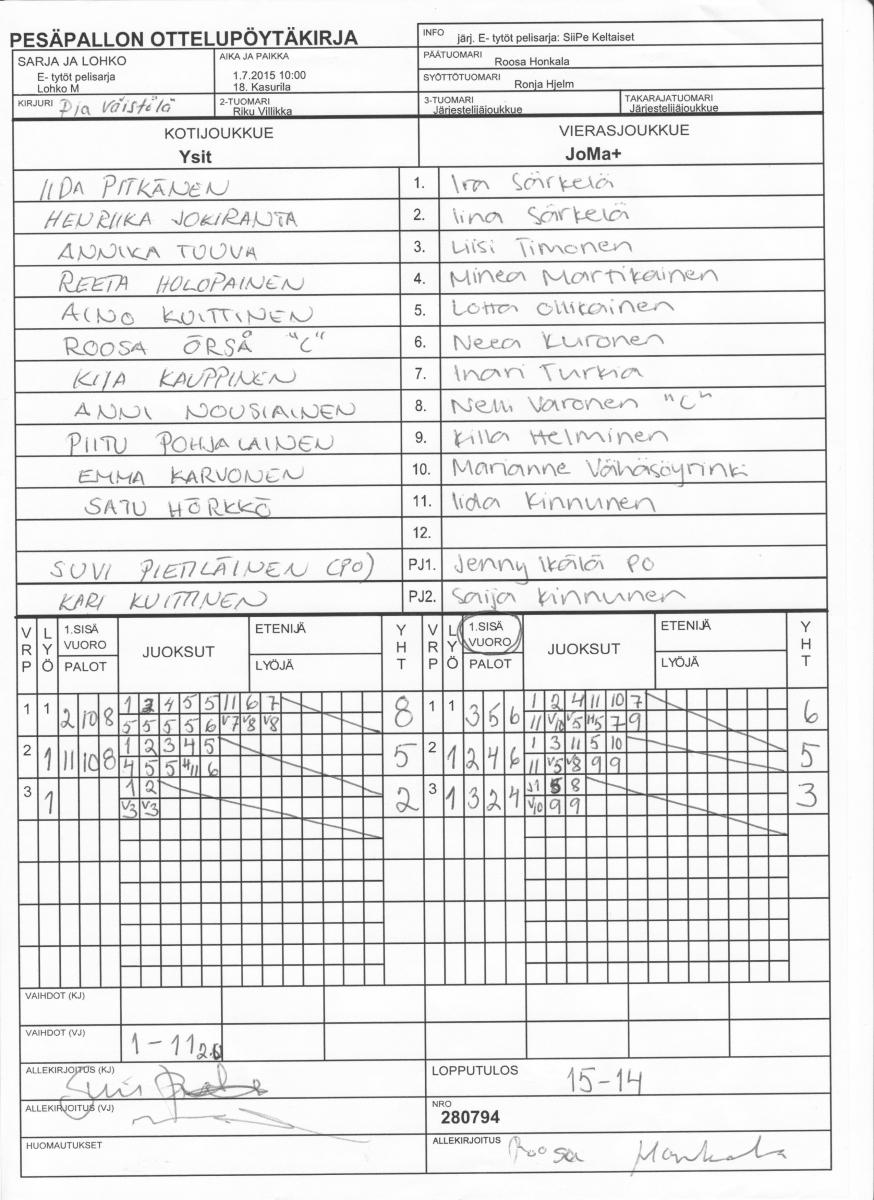 | Lohko K | 2.7.2015 10:00 | 18. Kasurila | KaKa | SiiPe Keltaiset | Ysit |