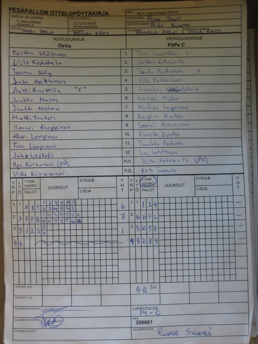 | C- pojat pelisarja - Alkulohko A | 28.7.2015 08:30 | K6 Pateniemi | Espoo | OsVa | PäPe C |