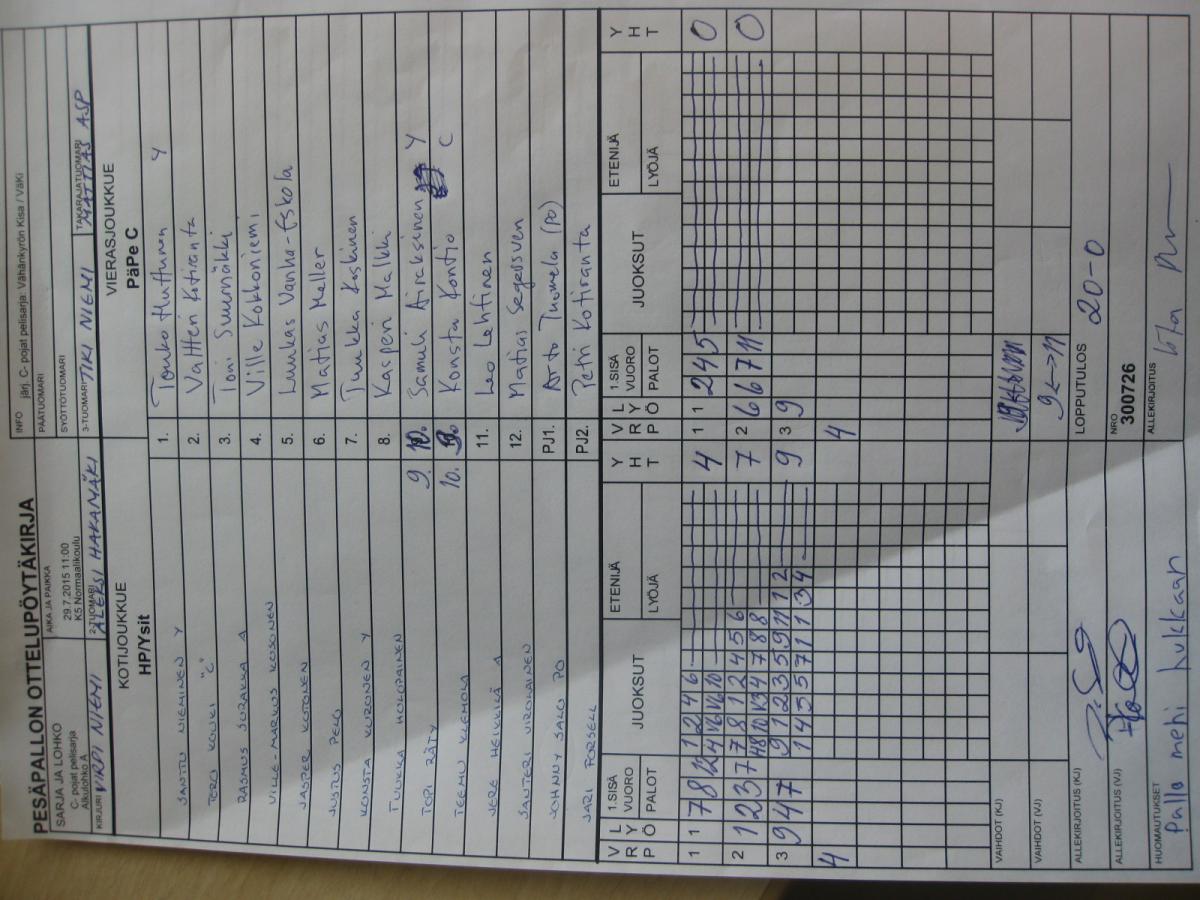 | C- pojat pelisarja - Alkulohko A | 27.7.2015 19:45 | K6 Pateniemi | HP/Ysit | NaPe | PäPe C |