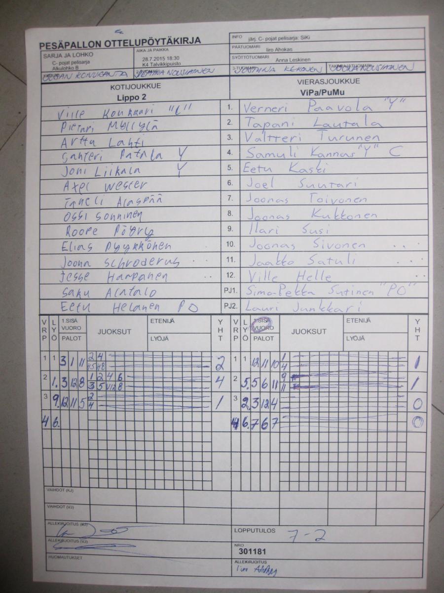 | Ristikkäisottelut 5-8 | 30.7.2015 15:45 | K23 Hönttämäki | URA | Lippo 2 | ViPa/PuMu |