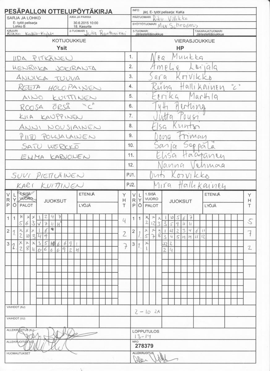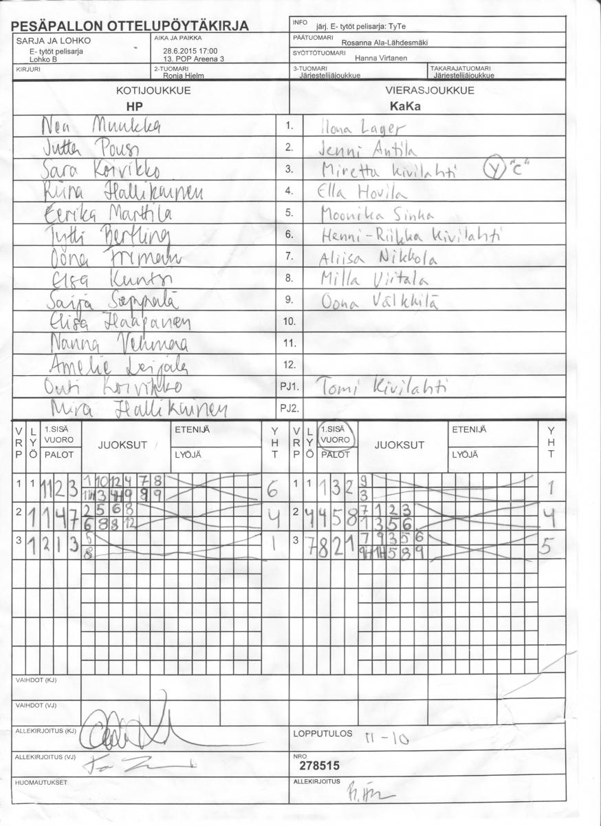 | Lohko H | 1.7.2015 10:00 | 13. POP Areena 3 | TyTe | VePe | HP |