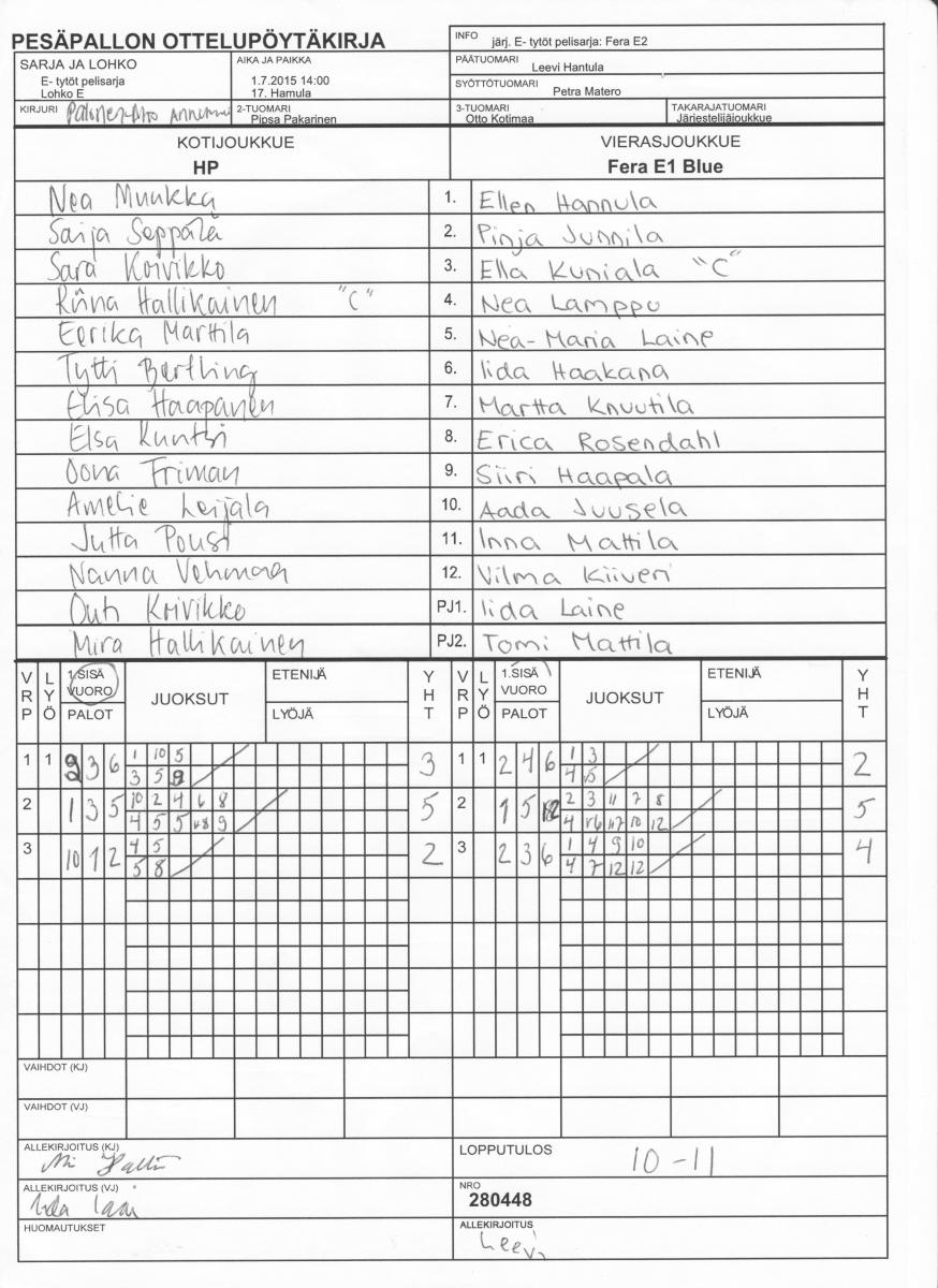 | Lohko H | 2.7.2015 08:00 | 13. POP Areena 3 | VePe | SiKi | HP |