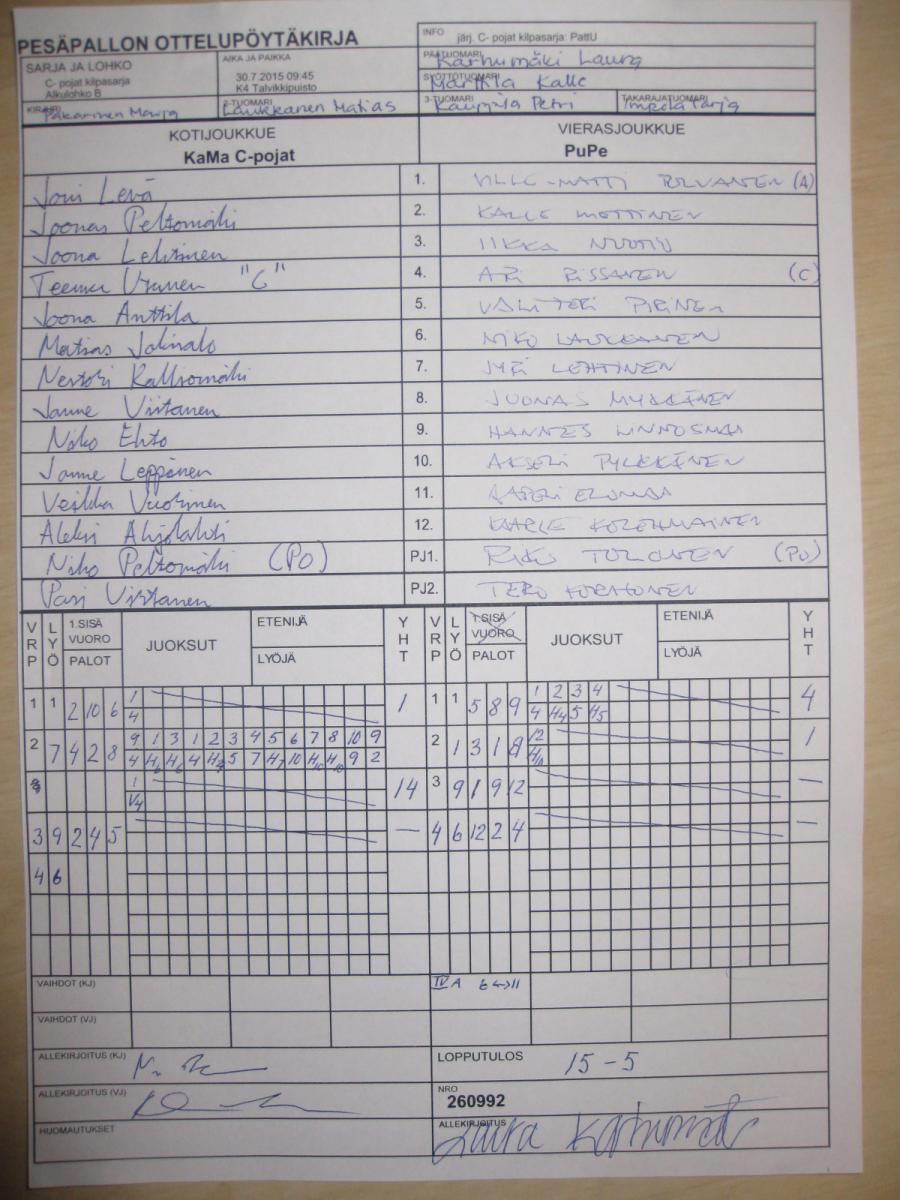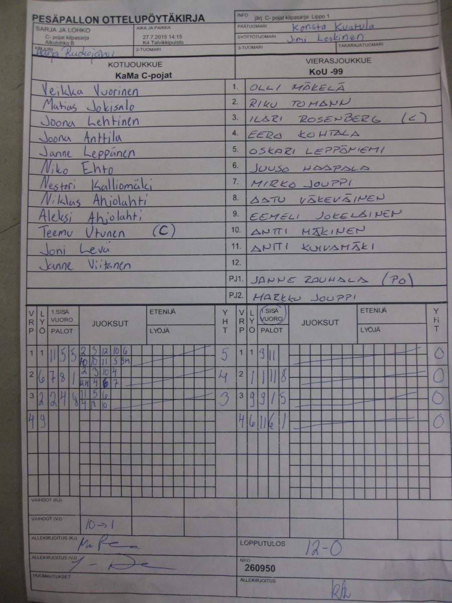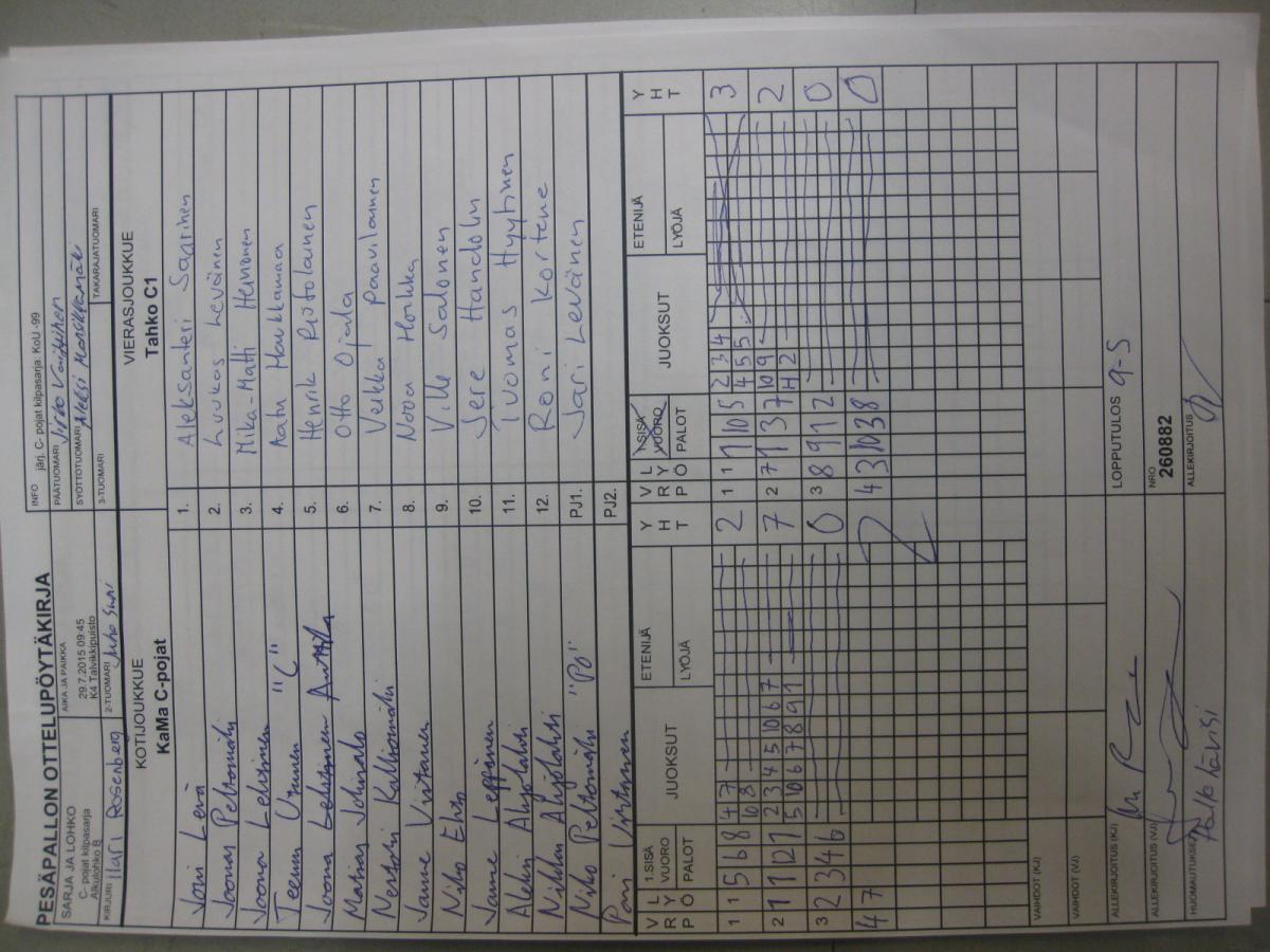 | C- pojat kilpasarja - Alkulohko B | 27.7.2015 08:30 | K1 Stadion Oulu | PuPe | Tahko C1 | KaMa C-pojat |