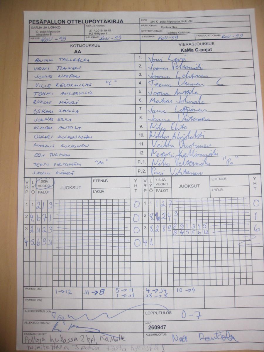 | C- pojat kilpasarja - Alkulohko B | 27.7.2015 18:30 | K2 Niittyaro 1 | Lippo 1 | KoU -99 | KaMa C-pojat |