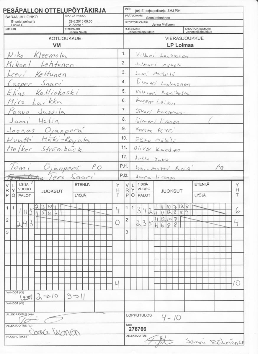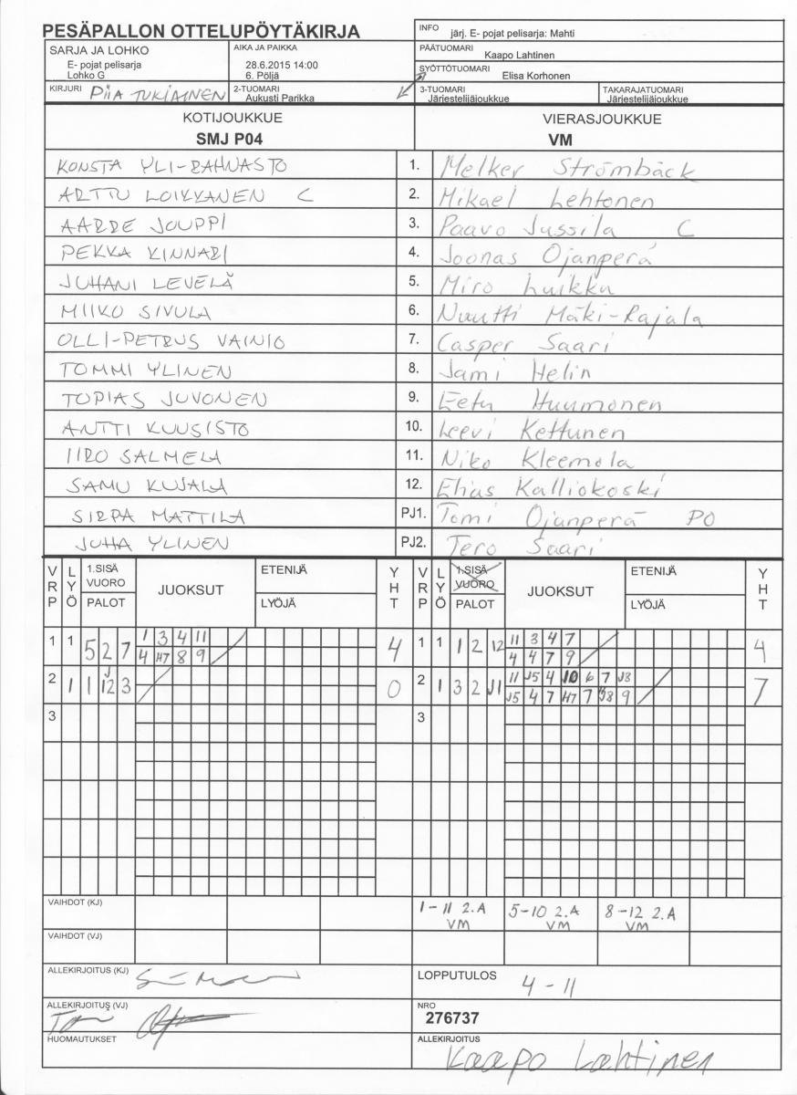 | E- pojat pelisarja - Lohko G | 29.6.2015 08:00 | 2. Ahmo 1 | SiiPe Keltaiset | SMJ P04 | VM |
